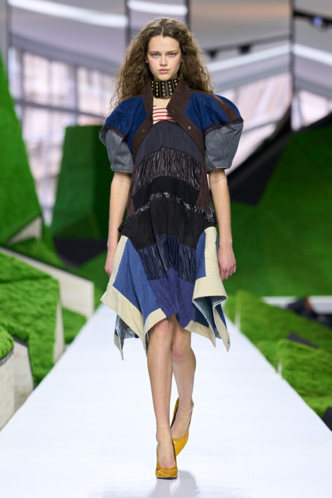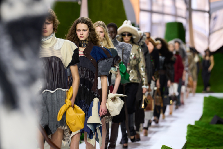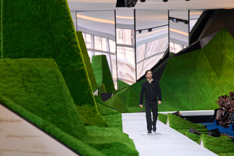 La sfilata si svolge nella Cour Carrée del Musée du Louvre, trasformata in un paesaggio immaginario. Lo scenografo Jeremy Hindle crea un ambiente che fonde interno ed esterno, natura e visione futuristica. Il risultato è una sorta di quadro pastorale vivente, un’allegoria moderna che ricorda una fiaba di fantascienza. Con questa collezione, Nicolas Ghesquière immagina una moda capace di guardare avanti senza dimenticare le radici profonde dell’umanità: il legame con la terra, con i paesaggi e con le storie che continuiamo a portare con noi.