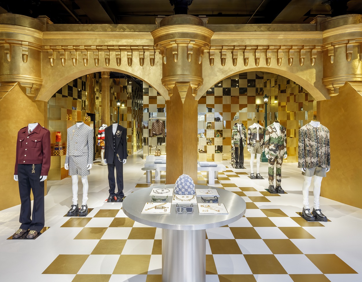 Il pop-up in Rinascente si ispira al concept della ricostruzione dorata del Pont Neuf, ponte e location della sfilata. Lo spazio è stato ricoperto da scacchi Damier dorati ispirati a raggi di sole, proprio come l’originale passerella parigina. Non mancano gli emblematici bouquiniste, luogo perfetto per ospitare le creazioni più iconiche della collezione, che insieme ad un lampione in miniatura trasportano i visitatori su uno dei ponti più celebri della capitale francese.