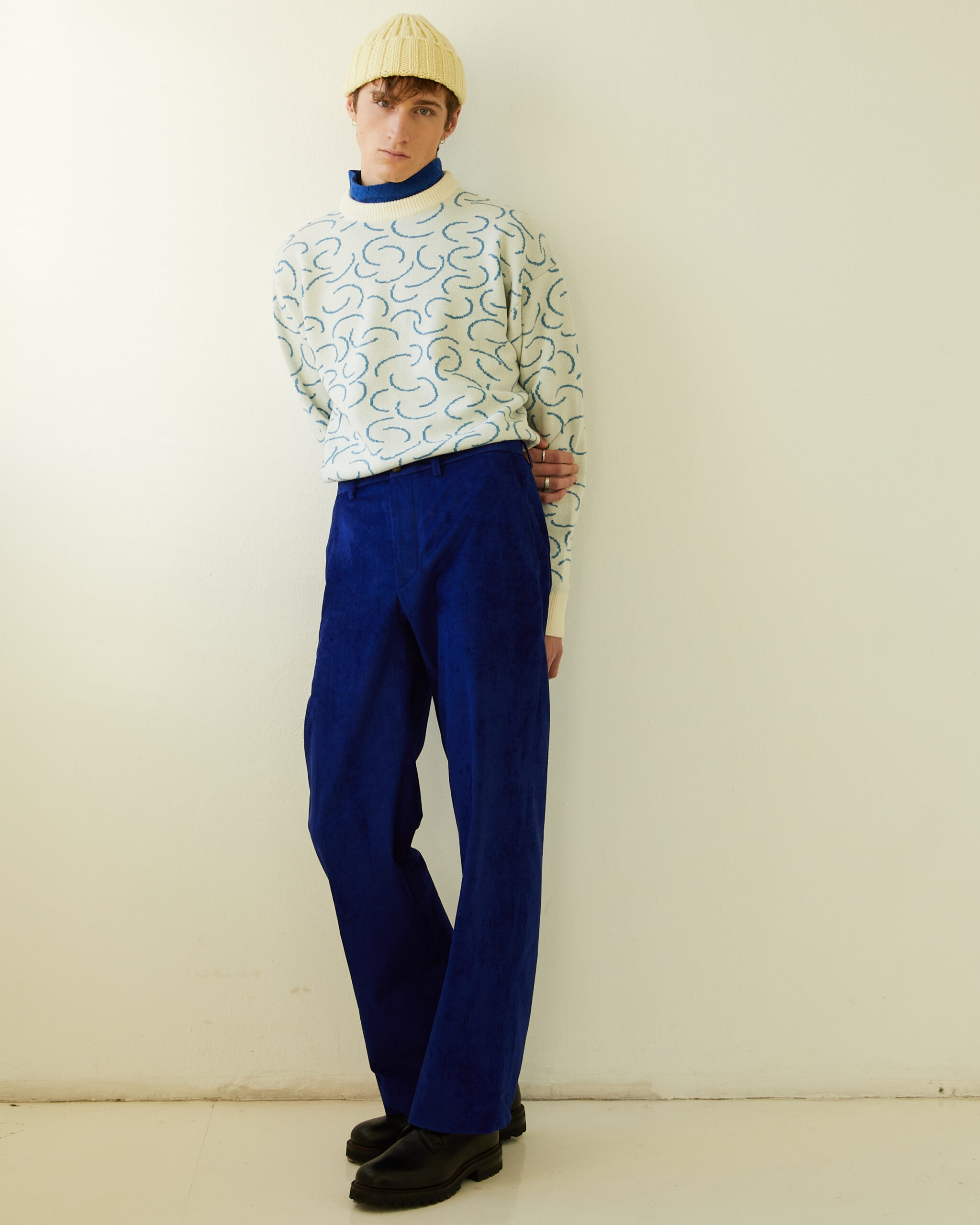 A ispirare il mood di stagione sono l’opera e lo stile del pittore inglese David Hockney, innovativo con le sue pennellate nette e brillanti come con il suo look in full colour. Da lì Larenza parte, declinando il merino extrafine in leggerissimi dolcevita con losanghe su collo e polsi, in gilet che mescolano trecce e trafori. E in una selezione di pezzi interamente fatti a mano con circa venti ore di lavoro ciascuno.