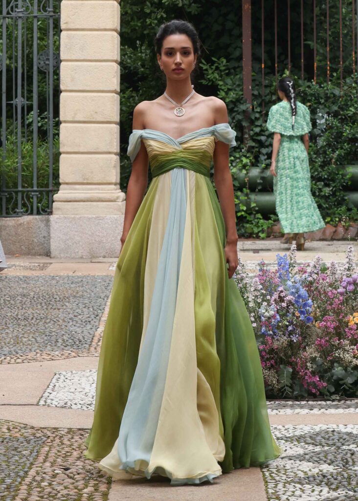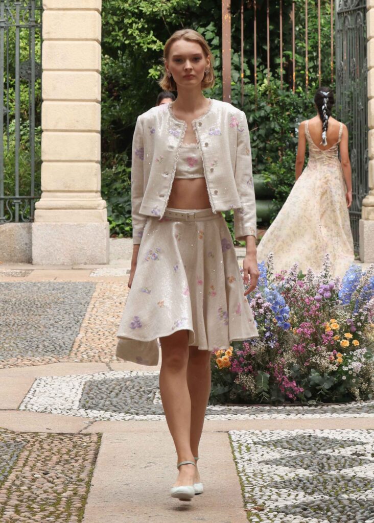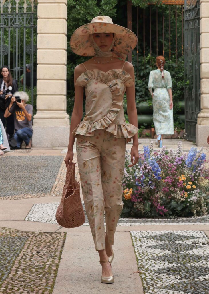 La palette è una brezza impalpabile: celeste sino al pervinca, rosa velato, il verde dell’erba appena spuntata, giallo sole e bianco puro, l’acqua di una rada mediterranea, con tocchi di cielo notturno. Cromie che evocano la gioia di un giardino d’estate, immagine di un’anima leggera, che sa ancora giocare e guardarsi con frivola ironia. I tessuti incarnano il savoir-faire tipico della couture che da sempre definisce il marchio: chiné leggero, tulle impalpabili, organze eteree e tweed intrecciati e sfrangiati, accanto ai più materici moiré (dai riflessi cangianti a mimare l’acqua) e broccato ton sur ton, solenne e disinvolto al contempo. Il giorno è quasi onirico, con giochi di trasparenze per tailleur e completi corsetto indossati su ampie sottane. Il pantalone capri con volute di fiori e rami si accompagna al top asimmetrico guarnito da rouche. Lo chemisier è striped operato con colletto over o full-printed con manica a tre quarti, sempre stretto in vita con un fiocco. Il mood è rilassato e raffinato e si completa con una proposta swimwear di bikini e costumi interi con i pattern della collezione. La stampe sono protagoniste: raccontano una natura fra reale e astratto, con fiori e ramage talora esili e definiti, altre volte densi e avvolgenti come una tela pittorica.