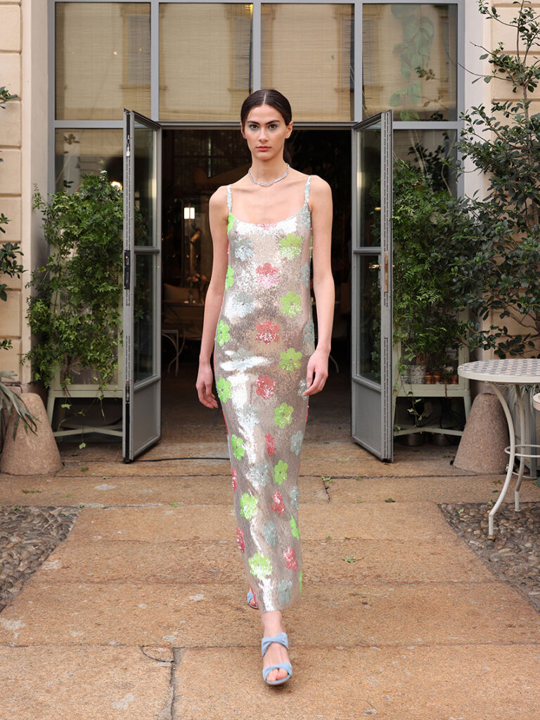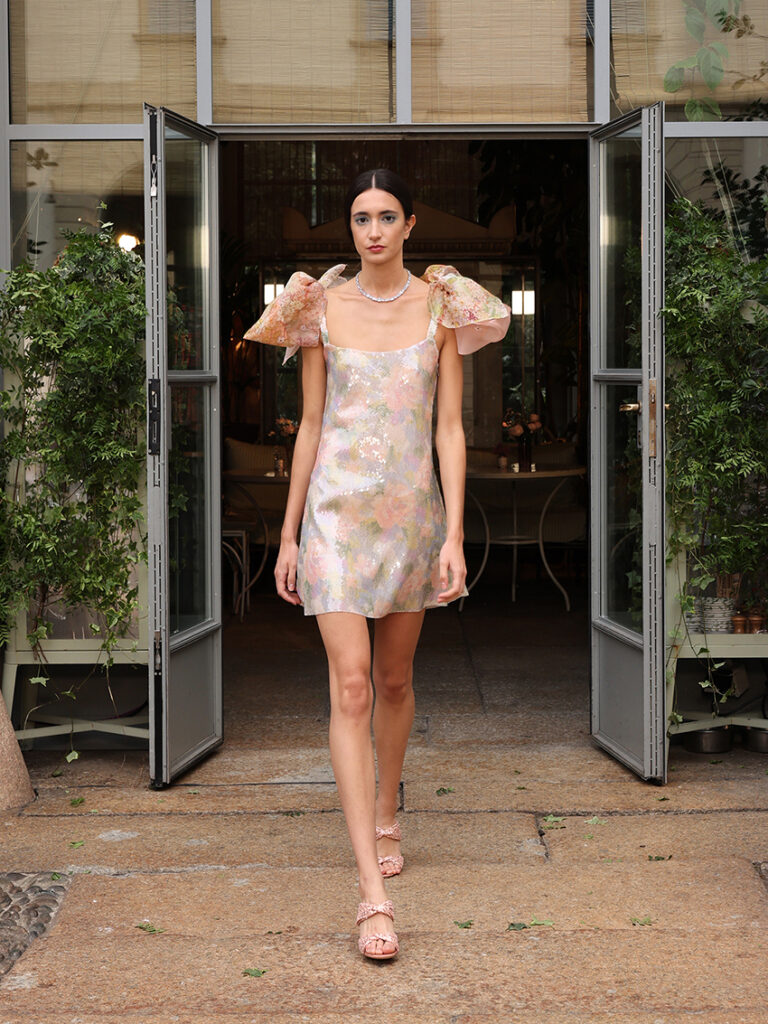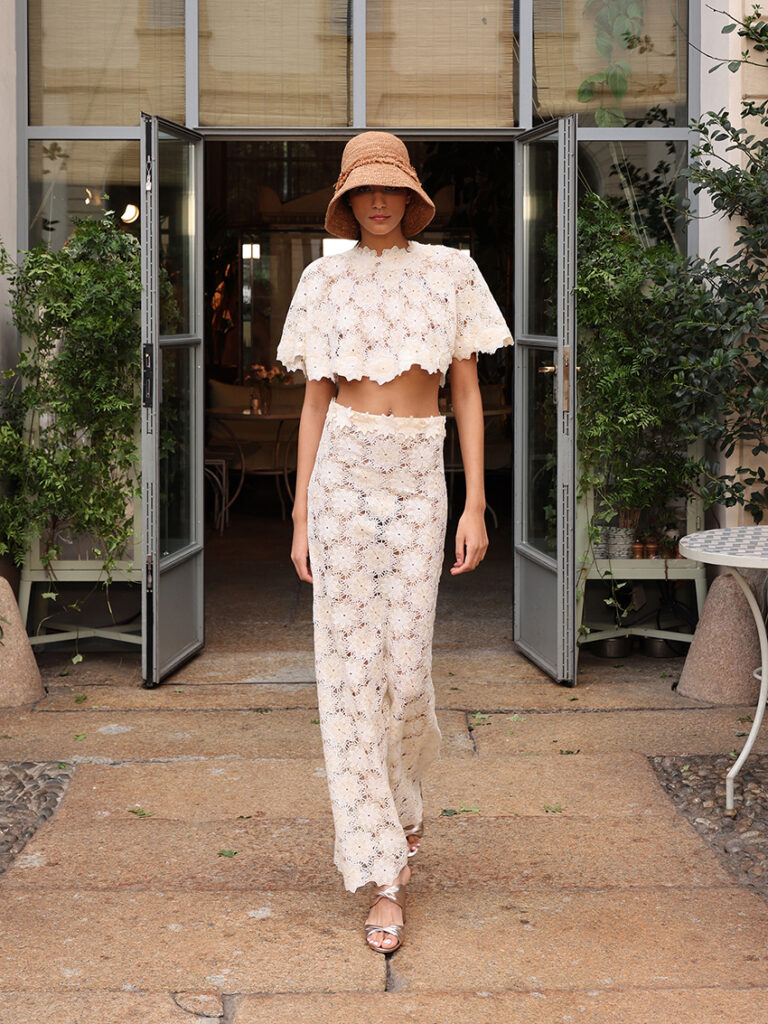 Per il giorno, il due pezzi è smanicato con motivo a quadretti dai toni terra e avorio con gonna svasata, o completo con blusa dalle maniche a tre quarti checked nelle sfumature del cielo, micro — che diventa tela su cui si dipingono piccoli fiori—, e maxi per le bordature. Lo chemisier in cotone operato dalla gonna ampia è a righe mosse dalla lavorazione fil coupé o in stampa ibrida tra quadretti Vichy e principe di Galles. Il pizzo macramé bicromatico dà vita a leggeri abiti nei toni della spiaggia o a bralette e crop-top, declinati anche in organza con impalpabili ricami 3d. Pantalone e sahariana versione gilet profilati in bianco si ingentiliscono con la blusa di cotone operato dalle maniche ampie. La sera, luci e iridescenze diventano protagoniste con ampi abiti di tulle ricamati a formare rombi di paillettes o organze completamente ricoperte con sovrastampe o ricami a contrasto bronzo-argento. Ritorna anche il Vichy, su un lungo abito con la gonna incrociata e sopragonna di taffettà appuntata da fiocchi. Tra gli accessori: nei capelli fiocchi dalla forma insolita — ispirati da un pezzo haute couture d’archivio Luisa Beccaria del 1994 —, sandali con nodo torchon nei tessuti della collezione, borse secchiello e cappelli in paglia lavorata a mano effetto uncinetto.