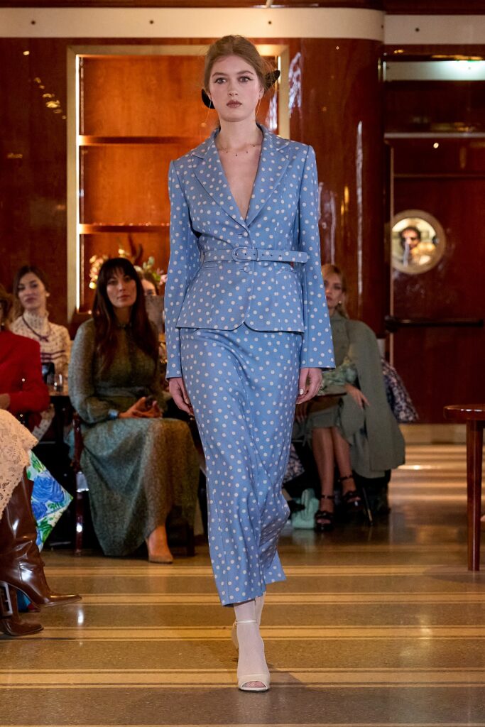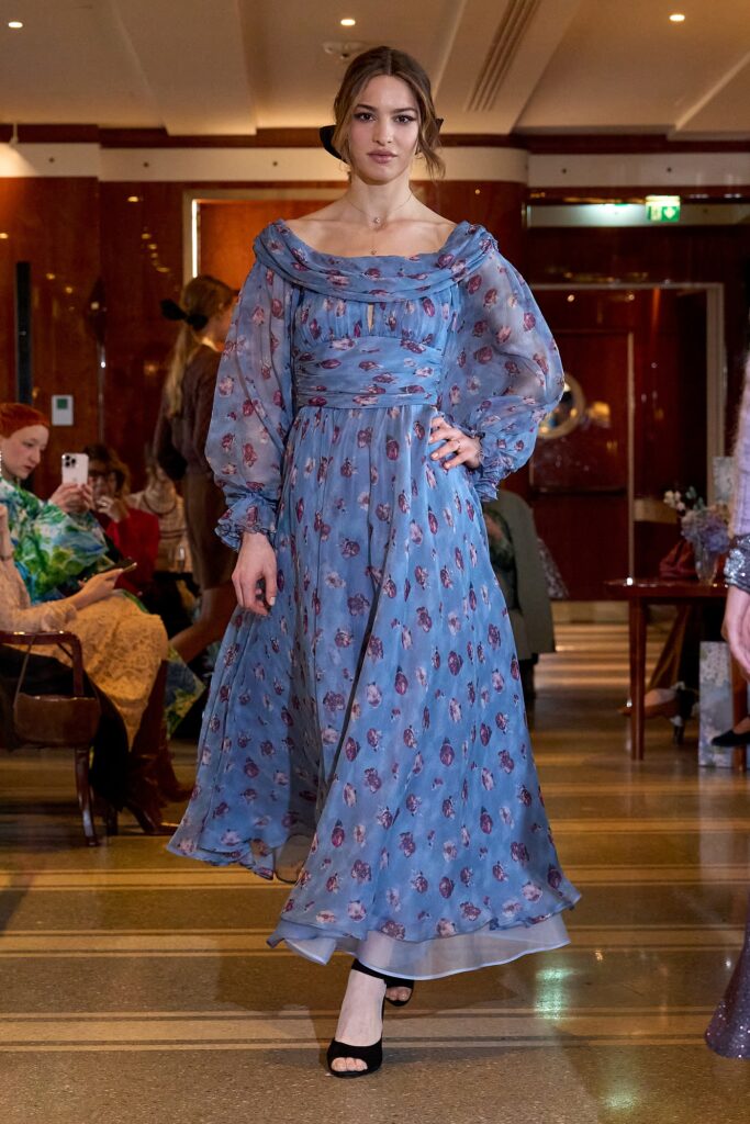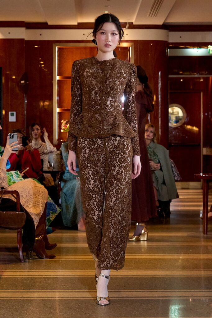 La collezione Di Luisa Beccaria FW25-26 è un omaggio alla femminilità e all’eleganza anni ’50, rivisitata in chiave moderna. La stilista propone silhouette scultoree, tessuti preziosi e una palette cromatica che spazia dai toni caldi della terra ai blu del cielo, con tocchi di luce dorata e argentata. La collezione è un mix di capi ampi e fascianti, con un’attenzione particolare al punto vita e au dettagli luminosi come rouches e paillettes. I materiali variano dal tweed al velluto, dal mohair alla georgette, con un’ampia scelta di pizzi e ricami.