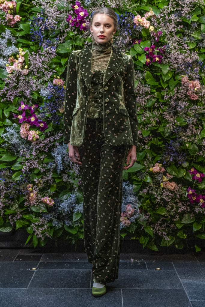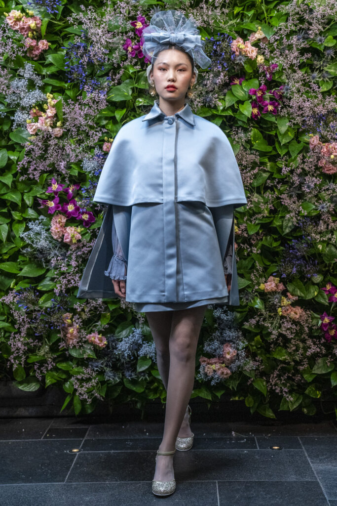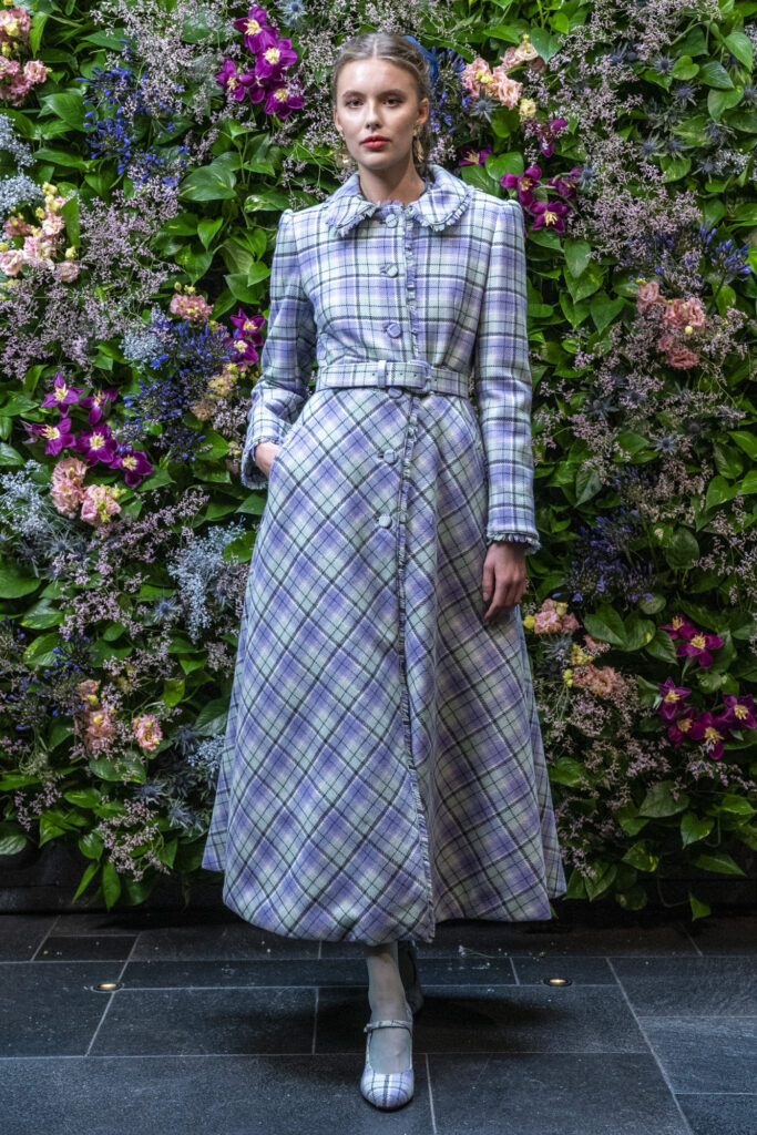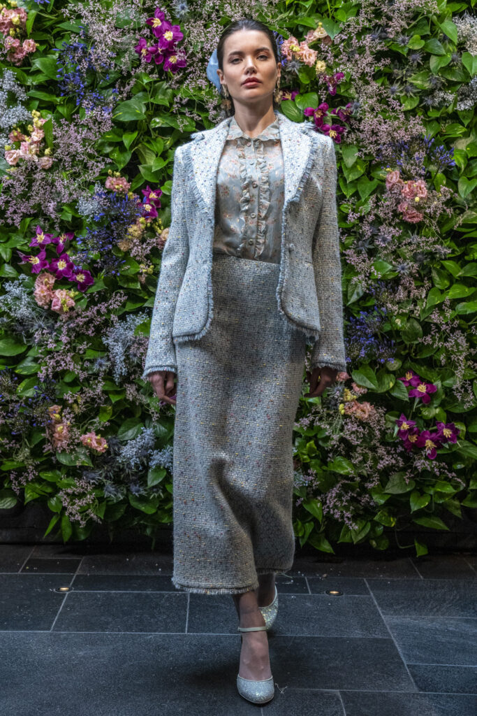 Protagonisti sono tessuti preziosi e vibranti: lo scozzese reinterpretato in chiave romantica, tweed luminosi con paillette tono su tono, velluti ricamati, pizzo di velluto e jacquard tridimensionali. I tulle ricamati e gli chiffon fantasia evocano giardini d’inverno, tra leggerezza e poesia.
