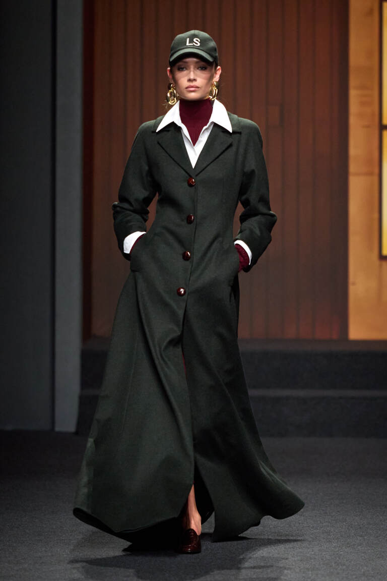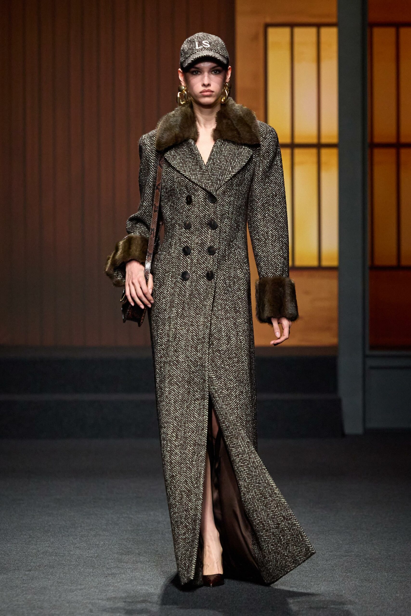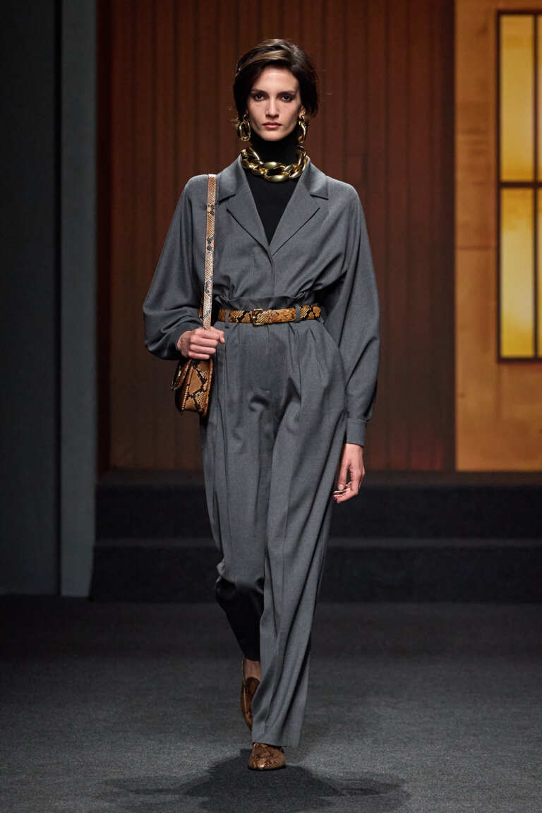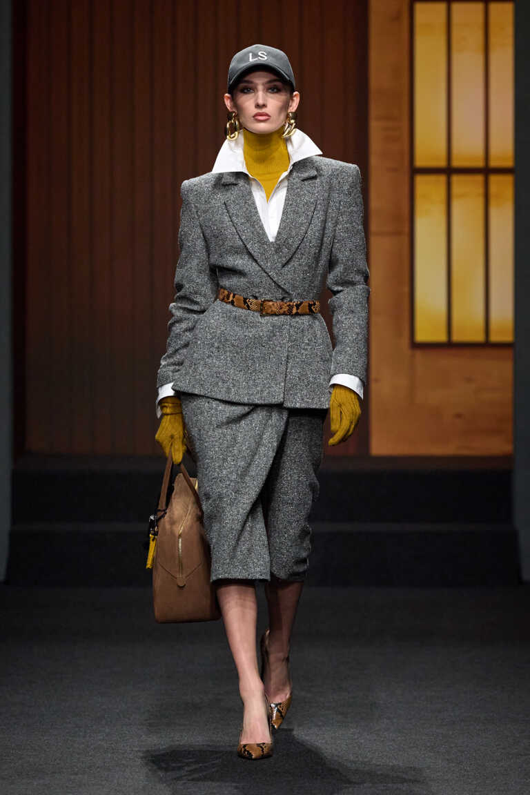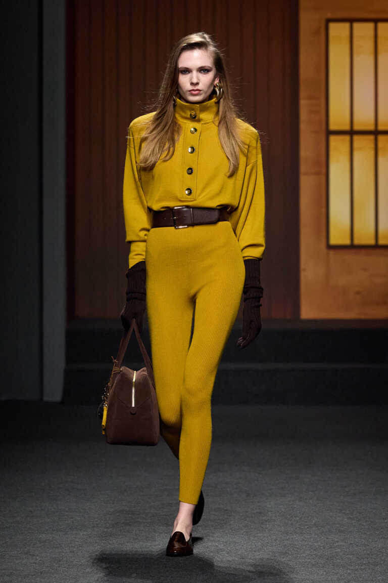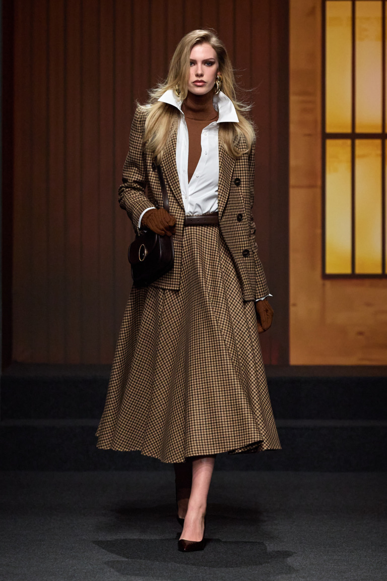 Le silhouette sono definite: spalle importanti, pantaloni a vita alta, minigonne, cappotti avvolgenti in tweed e loden, presentati in uno scenario che richiama il Seagram Building. Il colore è materico e profondo — marrone, caramello, grigio pietra, nero mezzanotte — con accenti senape, bluette e bordeaux.