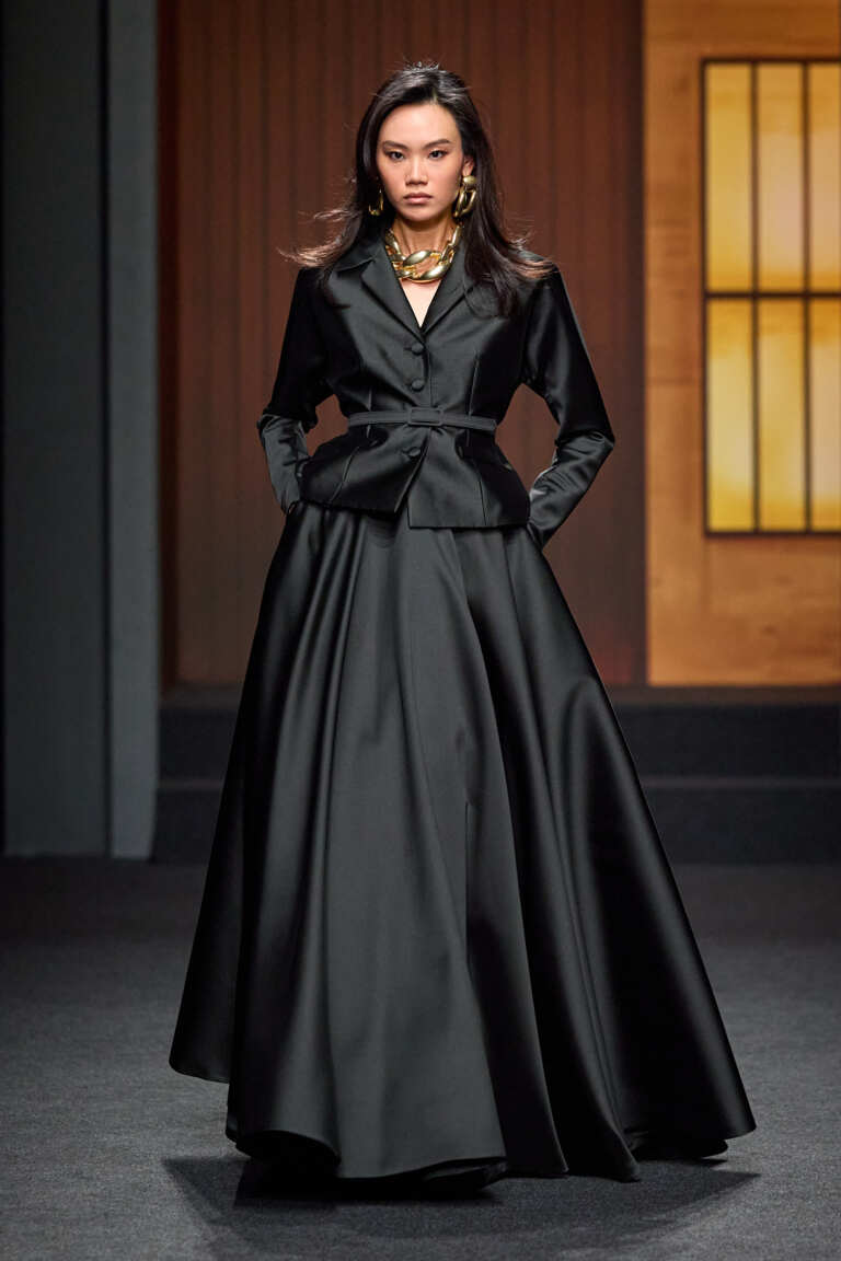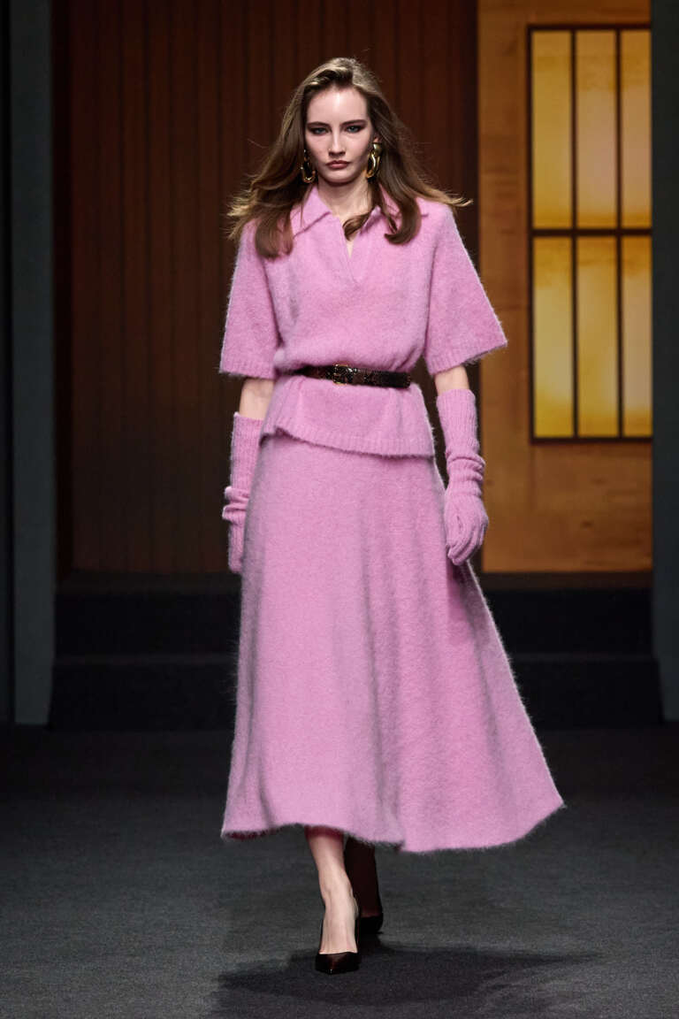 La maglieria in mohair e merino conferma il lusso discreto della maison. Tre i capitoli stilistici: Daily Attitude, sartoriale e strutturato; Natural Confort, fluido e rilassato; Midnight, apice serale in raso duchesse e velluto nero.
