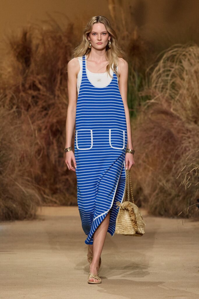 La palette cromatica spazia dal corallo al limone, dal rosa al pervinca, fino a cacao e bronzo, con contrasti grafici in bianco e nero. Maglieria e stampe — righe marinière anni ’60 e fiori rivisitati — completano un guardaroba che respira con chi lo indossa.
