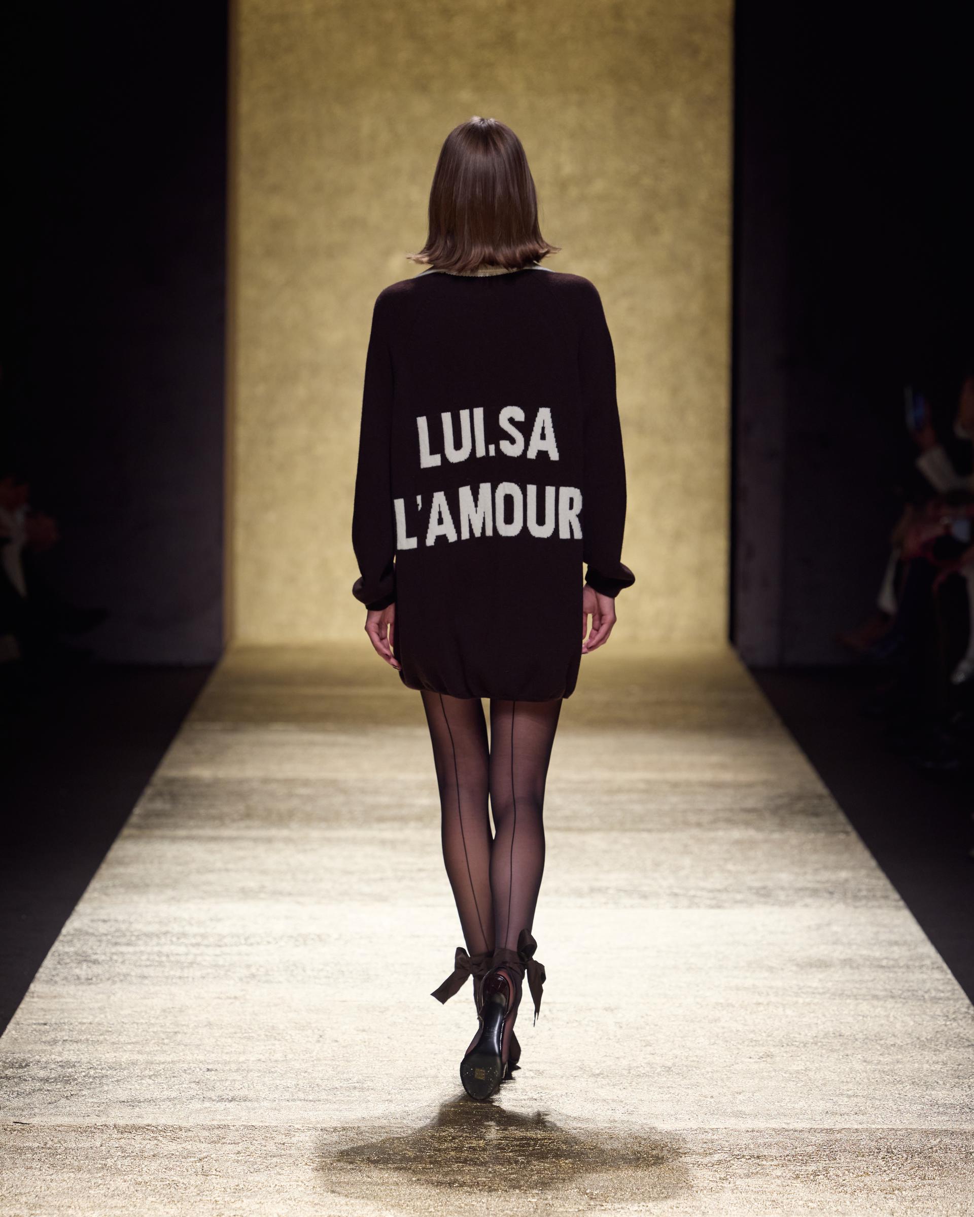 Il gioco sensuale di Lui.Sa L’Amour, l’amore per sé stesse che proietta la loro personalità nel mondo: è sempre Lei al centro di tutto, la donna Luisa Spagnoli AI25 che declina lo stesso capo in più varianti, sempre con le calze e il tacco basso, la maglia femminile con pantaloni maschili, il fruscio delle ruches dosate con dolcezza.