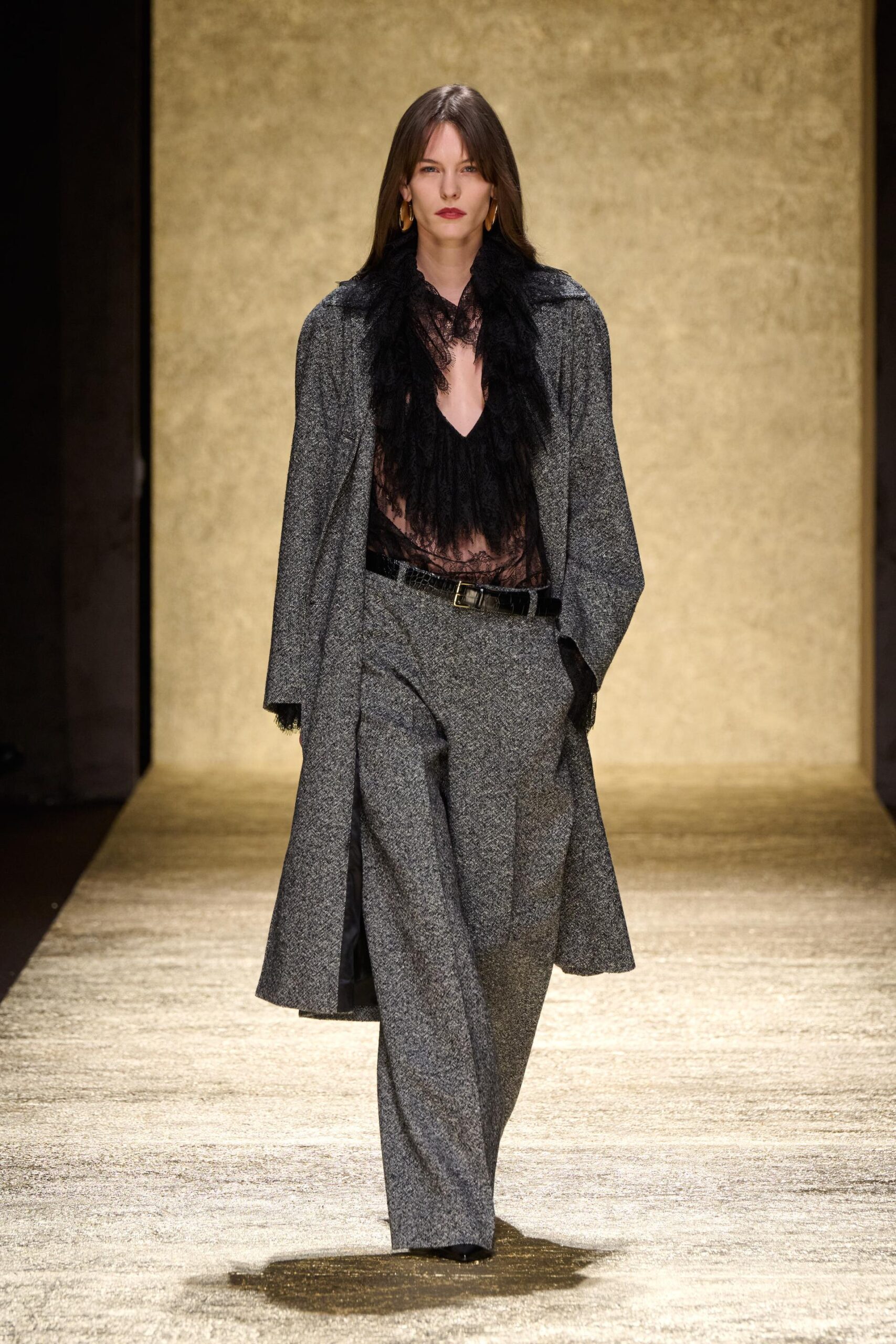 Una collezione di tessuti prima ancora che di colori e forme: le proporzioni attuali dei capispalla un po’ over, un po’ più lunghi tagliati con precisione millimetrica, la silhouette ripetuta che si articola su vari tessuti. Il soprabito in morbido tweed dalla mano leggerissima ma declinato anche in stampa cocco, in double di cashmere. Il taglio sartoriale inglese del Macintosh rivisitato dalla tradizione italiana, reso soffice, un sussurro.