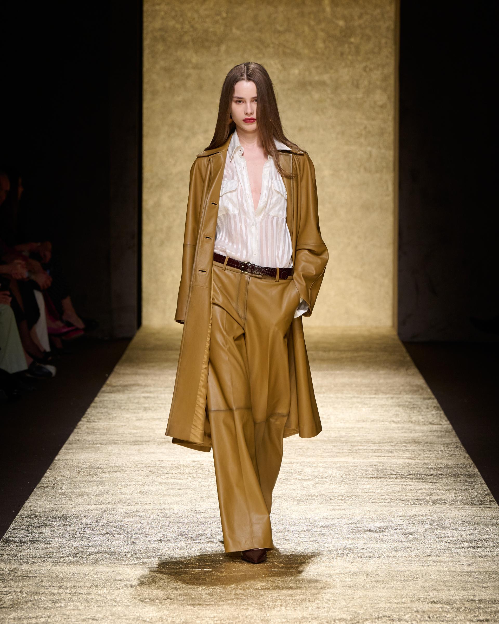 La maglieria viene declinata in abiti lunghi che presentano – anche qui – delicate rouches, nell’equilibrio del chic e del funky. Il saper fare è al centro della collezione e, necessariamente, dei look in pelle e dei capispalla: sartorialità precisa, sempre con le proporzioni che si ripetono declinate nei differenti look.