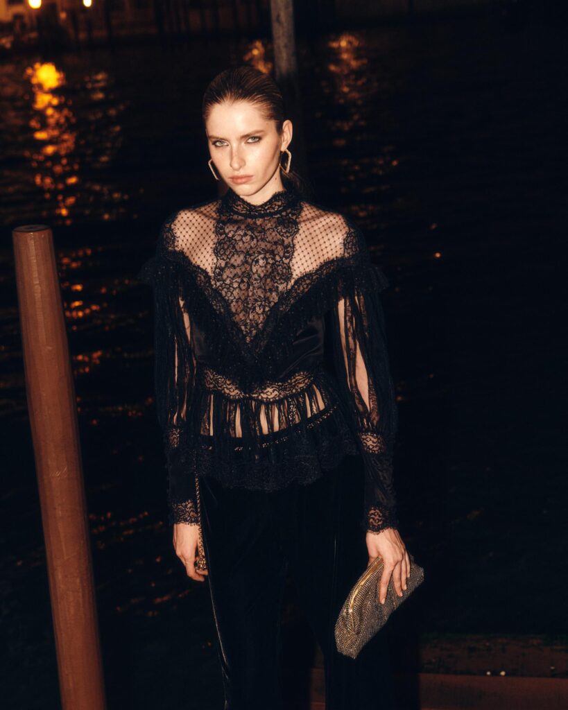 Abiti lunghi dal sapore etereo, bluse leggere e trasparenze delicate si alternano a jumpsuit interamente ricamate da una pioggia di micropaillettes, mentre tailleur in velluto liscio o pizzo prezioso riscrivono i codici dell’eleganza serale. Ogni capo sembra catturare la luce e rifletterla in sfumature cangianti, in una palette che spazia tra neri intensi, oro liquido e bagliori notturni.