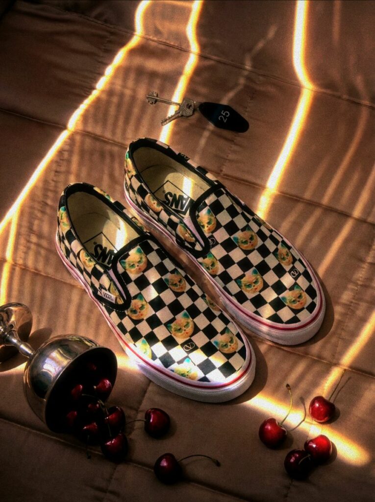 La collezione si compone di sei modelli unisex che reinterpretano l’iconica Classic Slip-On di Vans, una delle silhouette più riconoscibili nella storia delle calzature. Nato nel 1977 come simbolo di semplicità, comfort e spirito skate, il modello Slip-On diventa qui una tela espressiva su cui si innestano i codici estetici di Valentino.
