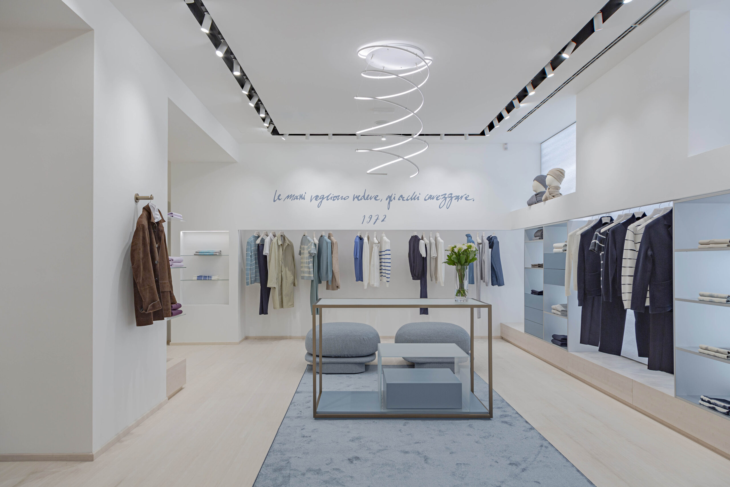 Con tre vetrine su strada e uno spazio di 190 metri quadri suddiviso su due piani, la nuova boutique rappresenta una fusione di culture, un connubio tra Oriente e Occidente, nelle scelte di certe finiture. Per sottolineare l’attenzione all’ambiente e alle foreste, che Malo sta già attivamente sostenendo con progetti di riforestazione sul proprio store online, nel suo nuovo flagship store milanese la maison icona del cashmere ha voluto evitare l’abbattimento di alberi e ha optato per una pavimentazione e arredi in bambù.
