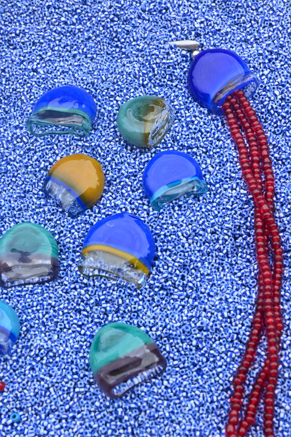 Simbiosi opera di Alessia Fuga e Marisa Convento – è un prezioso pendente declinato in tutti colori del vetro di Murano – che racchiude due tradizioni dell’alto artigianato veneziano: l’arte della perla in vetro soffiata a lume e quella dell’infilatura all’antica maniera veneziana.