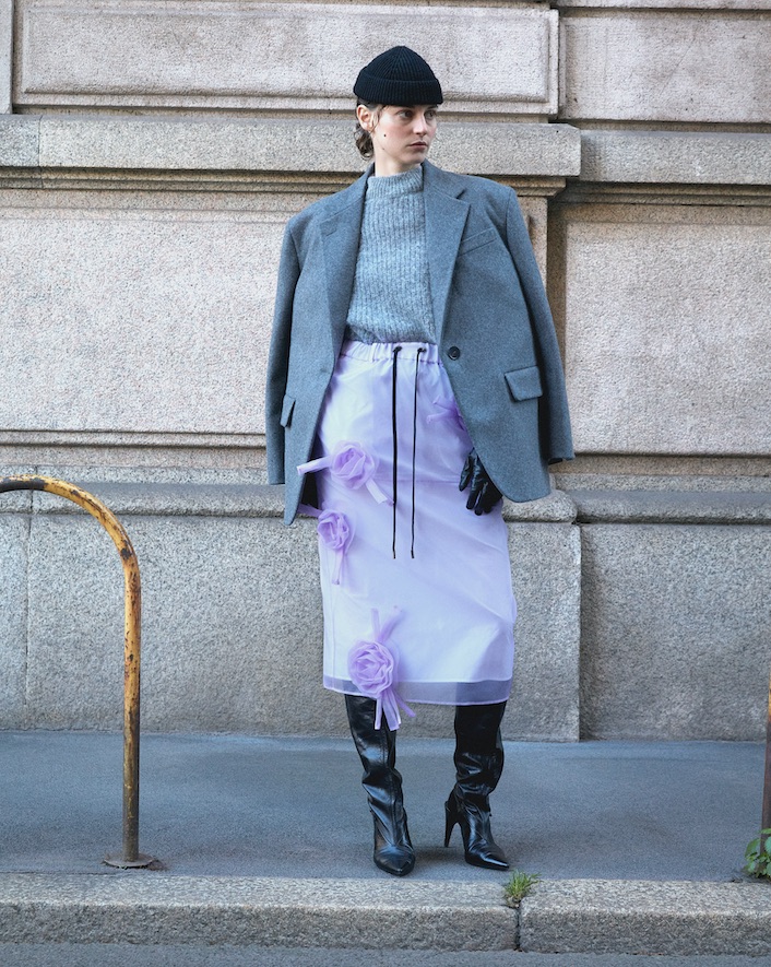 Il know-how dell’azienda sui capispalla viene tradotto nelle costruzioni couture delle giacche, che partono dai canoni maschili per raggiungere l’estetica femminile e sono curate nei minimi dettagli. Ci sono quelle con le spalle accentuate, che si allargano come negli anni ‘20 e con la vita segnata che rende omaggio alla sensualità. E poi le shirt jackets dal fondo laserato da portare in più modi. Sono pezzi versatili, creati per rendere unico ogni look, come la bow skirt personalizzabile e il bomber tecnico con maxi volume sulle maniche, perfetto in versione day or night. A fianco, anche i cappotti doppiopetto, che nascono dal blazer o diventano over.