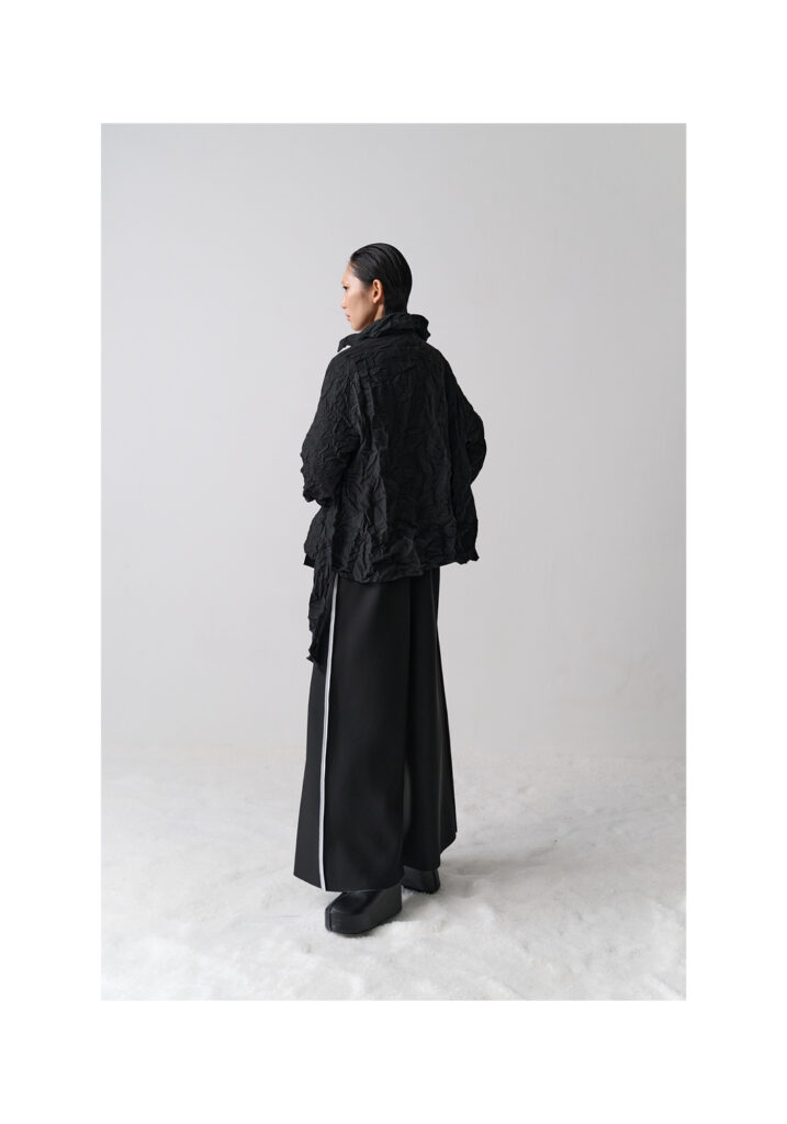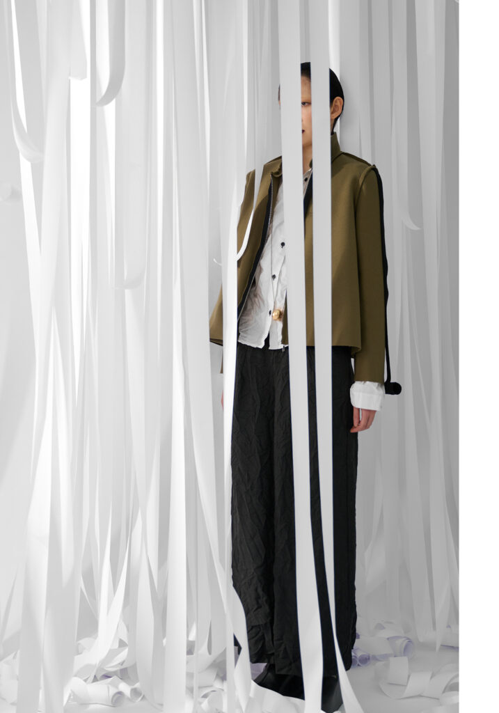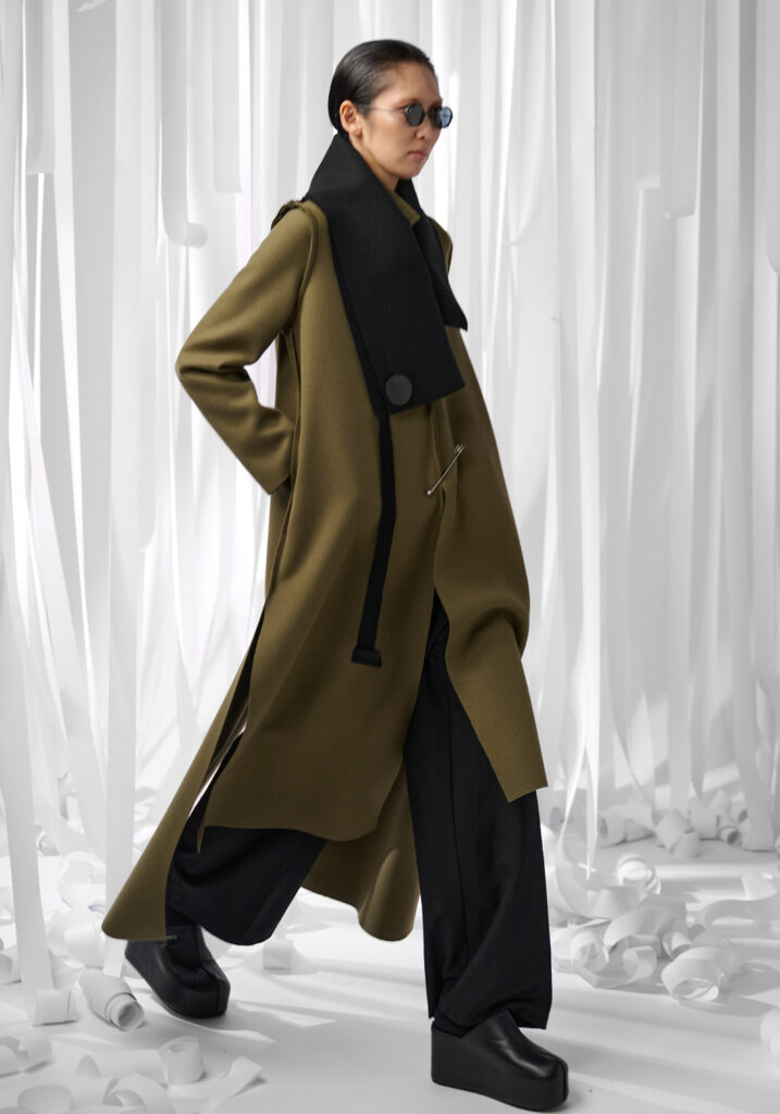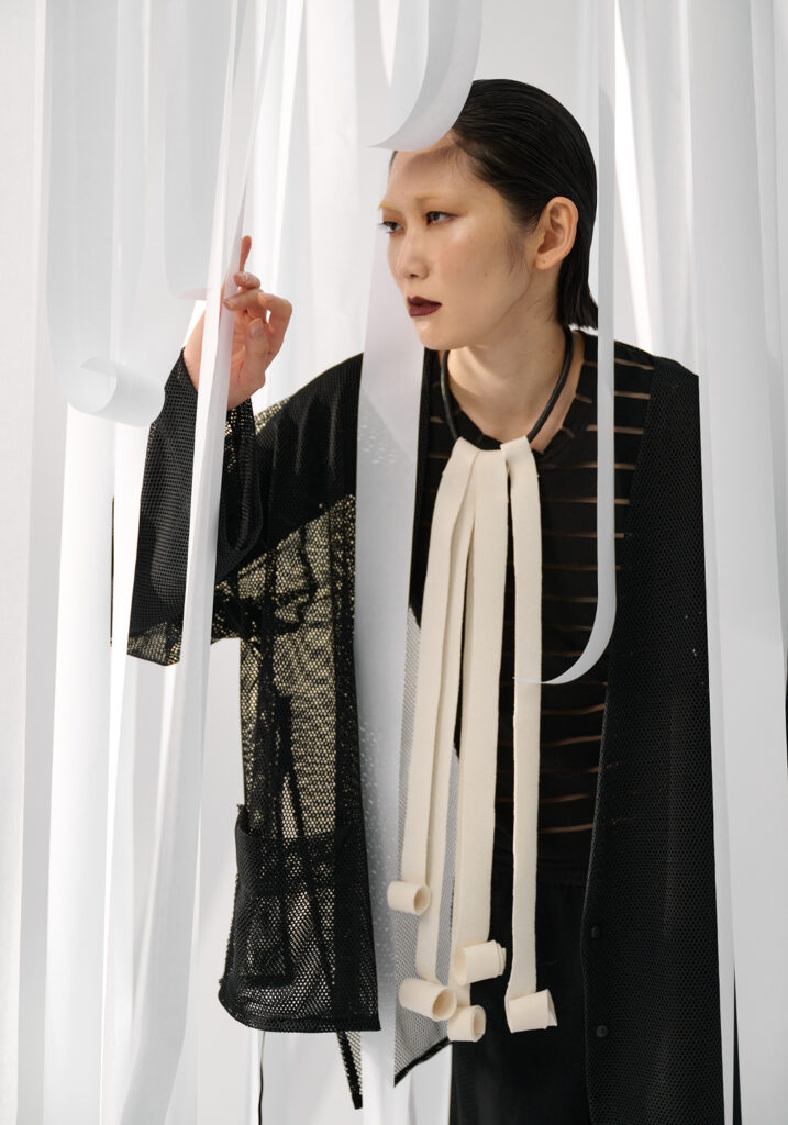 La nuova collezione – #U_TOUCH2 – sembra rispondere alla prima completandola attraverso l’analisi di ulteriori elementi dell’opera del grande maestro italiano. È così che i frammenti di un palloncino scoppiato cuciti su di un collo-sciarpa in feltro divengono un omaggio al famoso Fiato d’artista manzoniano; un segmento di tessuto in lana che sembra svolazzare dalla sommità della manica di una giacca diviene un invito ad indossare nel quotidiano l’idea delle Linee, opere richiamate anche nelle collane in movimento dove linee in feltro si arrotolano e si sovrappongono creando un gioco dinamico e imprevisto.