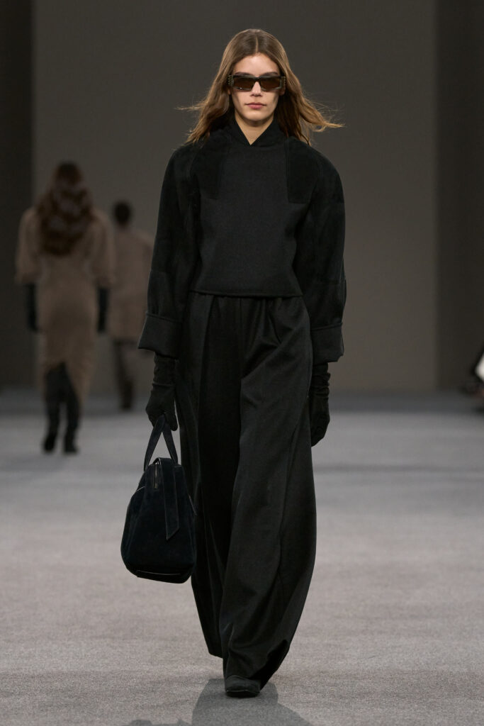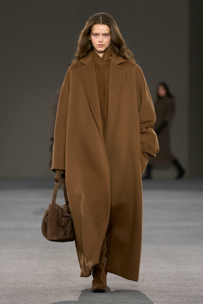 La collezione Autunno/Inverno di Max Mara ridefinisce l’utilitarismo attraverso tocchi di neo-medievalismo e gothic chic, ispirandosi a Matilde di Canossa come simbolo di forza, resilienza e stile senza tempo. Gonne maxi in cashmere a godet, tuniche da paggio in morbida pelle scamosciata, stivali ultra-piatti sopra il ginocchio, rivetti metallici e cappotti con inserti in nabuk reinterpretano con contemporaneità l’estetica medievale. L’artigianalità impeccabile e materiali autentici come cammello, cashmere, alpaca, mohair, lane pregiate, double-face lucenti e tessuti effetto teddy diventano compagni di vita, raccontando le storie delle donne che li indossano. Matilde di Canossa, abile diplomatica, leader militare e mecenate, diventa musa di Max Mara, incarnando equilibrio tra forza e serenità e ispirando la donna moderna a governare la propria vita con sicurezza e autorevolezza. L’archivio del brand, dai cappotti iconici del 1981 al leggendario 101801, continua a influenzare il presente, con tinte ispirate al manto del lupo, della volpe e del leone, immaginando una donna contemporanea come una nuova Matilde, regina del proprio destino.
