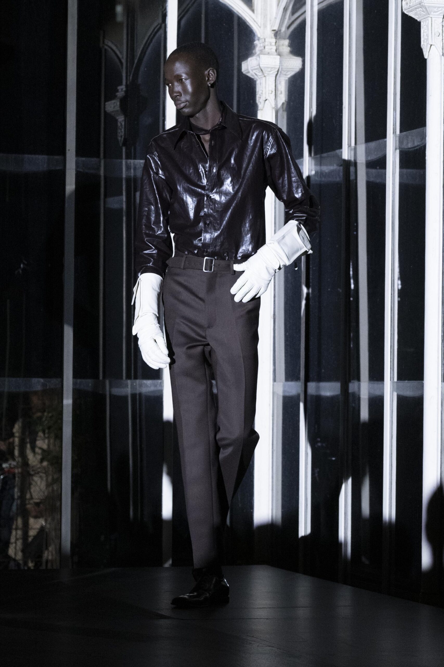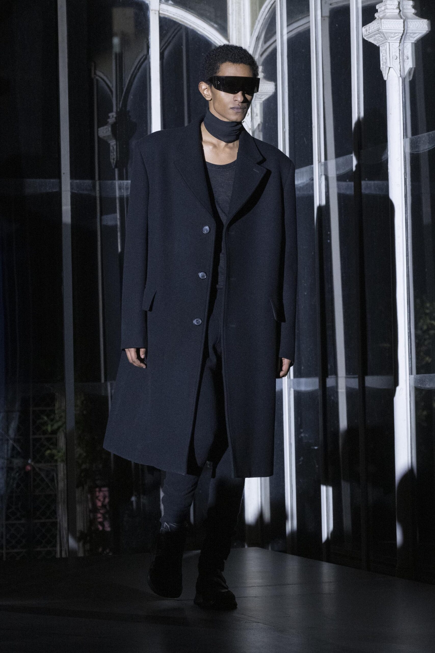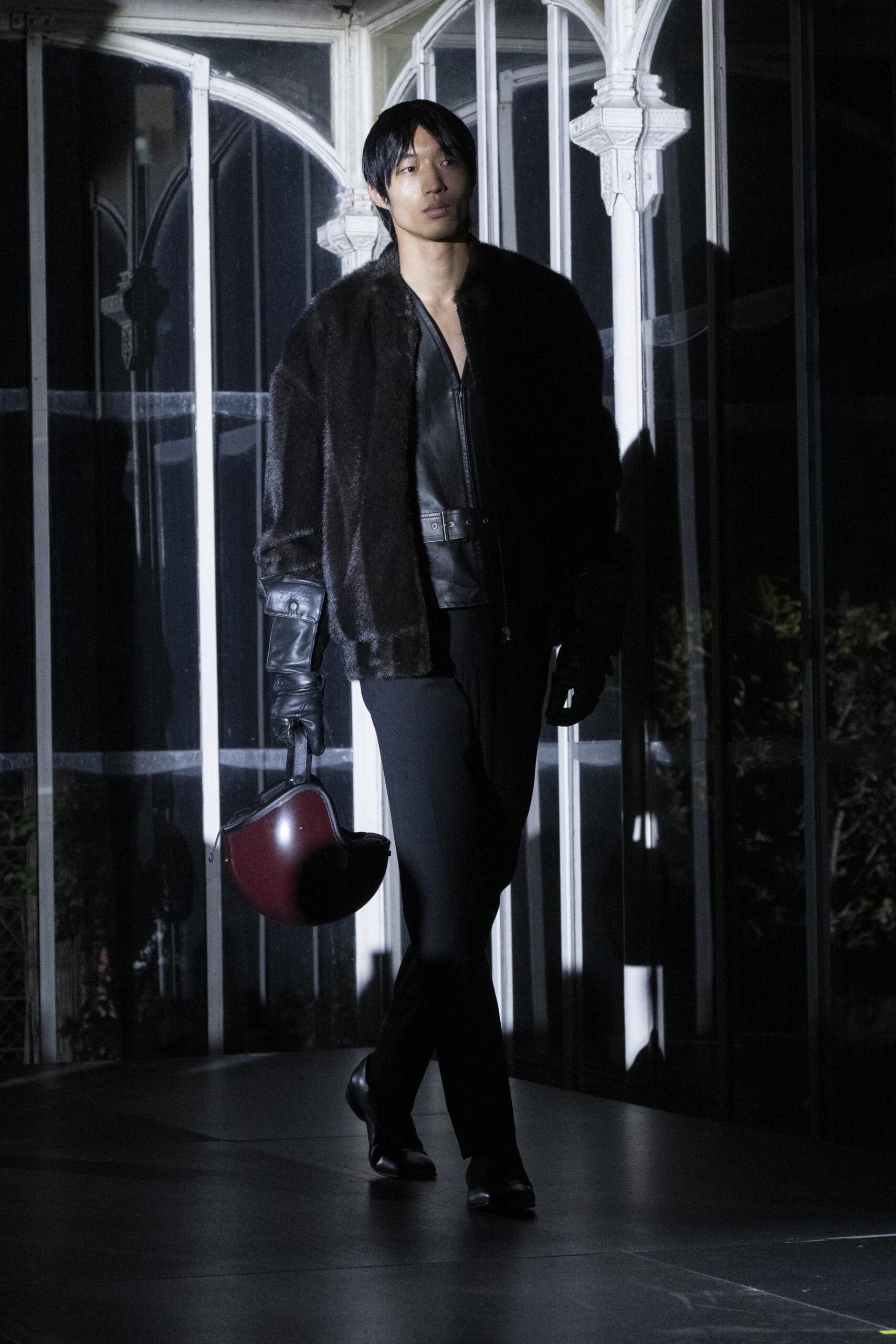 Il nero come un intero spettro di sfumature e atteggiamenti, dal bordeaux al nastro adesivo, visto attraverso pezzi e texture che vantano tradizione e sgargianza, in una sfilata che si svolge all’interno di una scatola di vetro, nella notte che luccica, nella città che è la capitale della moda di un certo modo di approcciare il menswear: dall’angolo del vestito.