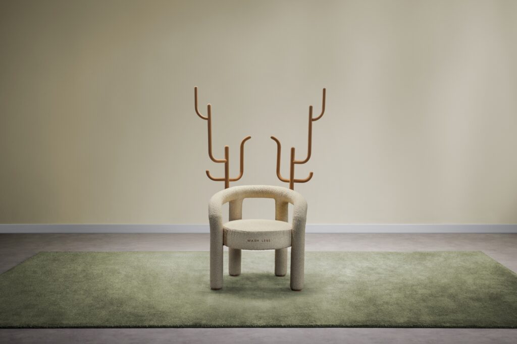 “In italiano, abito e abitare derivano entrambi dal latino habeo, avere”, spiega Fabio Novembre. “Questa profonda connessione linguistica ci invita a riflettere su come il nostro senso del possesso influisca sull’equilibrio del pianeta. Il design è uno strumento per plasmare e definire gli oggetti e scegliere di adornare una comoda seduta con forme che ricordano i palchi di cervo significa adottare il simbolo della rigenerazione di quell’animale. Questo è un promemoria quotidiano della sostenibilità, del nostro rapporto con il mondo naturale e della nostra relazione con i vestiti che indossiamo. ‘Lavare Meno’ diventa un mantra con cui confrontarsi ogni giorno prima di sprecare risorse inutili”.