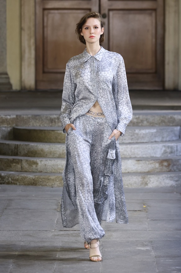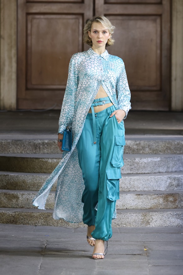 È un’unica, grande energia quella che nasce dal dialogo tra le due componenti di un eterno femminino in movimento, capace di seguire le fila di una visione anticonformista ed eccentrica racchiusa nell’estetica della SS24 del brand. Sono le linee e i colori di tessuti e gommature a creare un’ideale armatura alla femminilità – ma giocosa e sensuale!- i cui volumi a contrasto valorizzano silhouette essenziali e poetiche. Le stampe e i ricami si intrecciano con guizzi animalier in una dichiarazione edonistica che avvolge corpo e anima tra astrattismi e i giochi di trasparenze affini al mito.