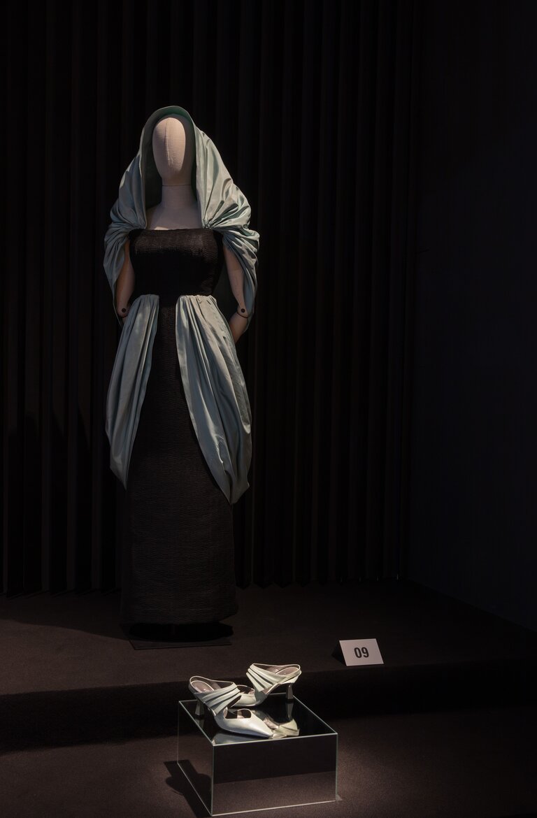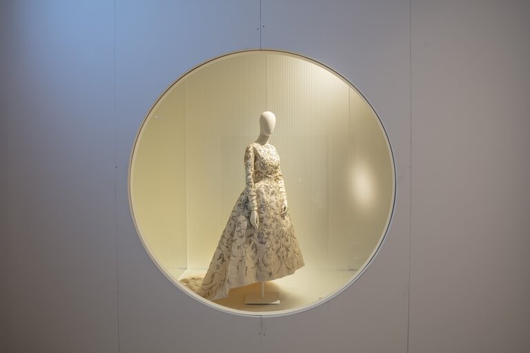 Allestita da Elisa Ossino Studio, all’interno di Palazzo Morando in via Sant’Andrea a Milano, occupa sia la grande area del piano terra dedicata alle esposizioni temporanee sia il prezioso Salottino dorato al primo piano dal delicato pavimento ad affresco, dove viene svelato l’ultimo abito di Balenciaga della mostra.