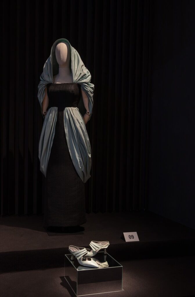 Il percorso espositivo, progettato da Elisa Ossino Studio, coinvolge il visitatore alla scoperta del mito Cristóbal Balenciaga. “Scale, basamenti, specchi e tendaggi mettono in evidenza le linee, le pieghe e i volumi degli abiti di Cristóbal Balenciaga, enfatizzandone l’aspetto architettonico. L’obiettivo dell’allestimento è esplorare i diversi aspetti della visione di Balenciaga: la tensione tra struttura e morbidezza, l’uso audace delle forme geometriche, l’equilibrio tra tradizione e innovazione che vengono narrati tramite elementi semplici dal significato simbolico,” dichiara Elisa Ossino.
