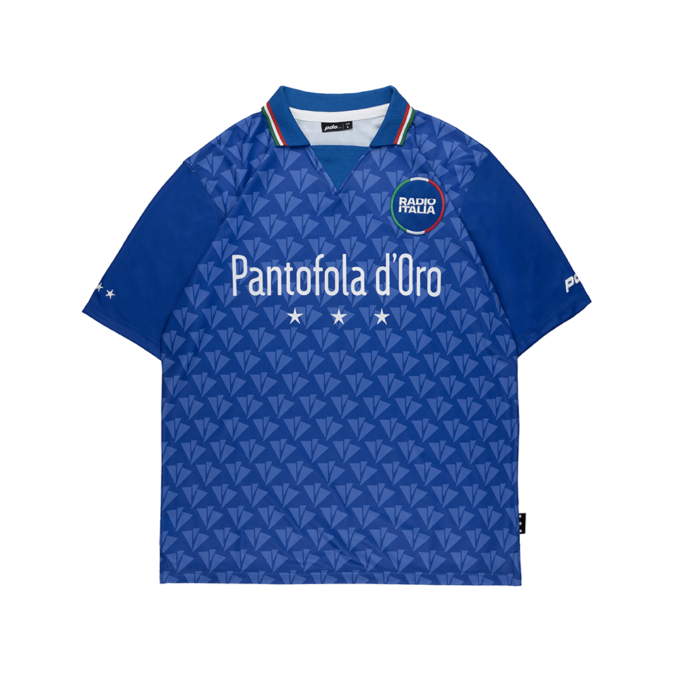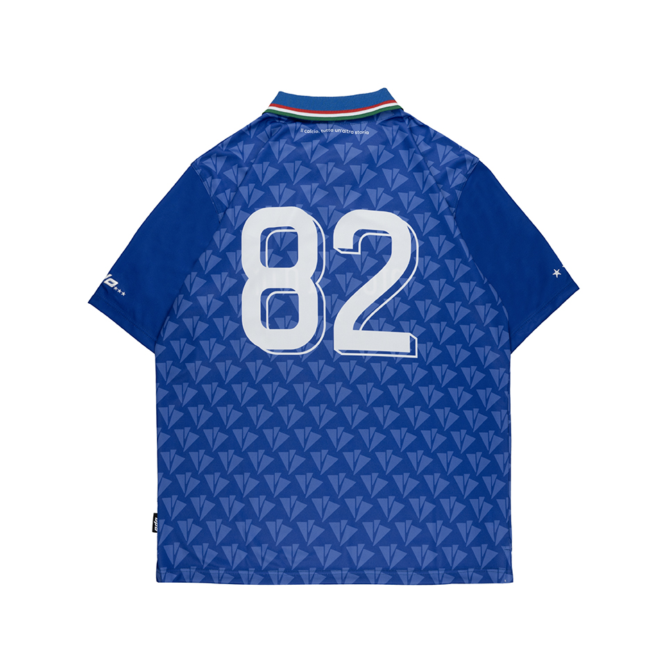 A completare la capsule Italia Ottantadue, una maglia celebrativa ispirata alle divise da calcio degli anni ’90: un mix di nostalgia e contemporaneità con pattern geometrico rétro, dettagli tricolore sul colletto e i loghi dei due brand sul petto. Un capo pensato per raccontare, attraverso lo stile, la passione per lo sport e l’intensità delle emozioni vissute sotto il palco.