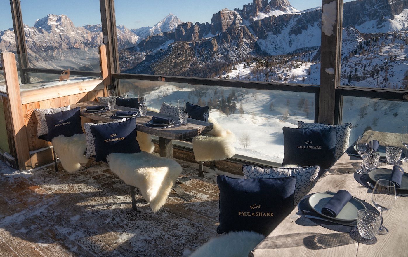 Quintessenza del progetto “Paul & Shark takes Cortina” è proprio lo chalet Scoiattoli, un rifugio storico, con travi a vista, tavoli in legno e una terrazza panoramica sulle iconiche cime Cinque Torri.