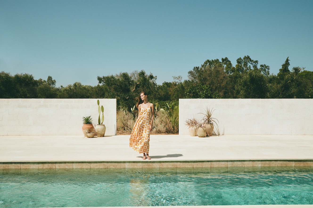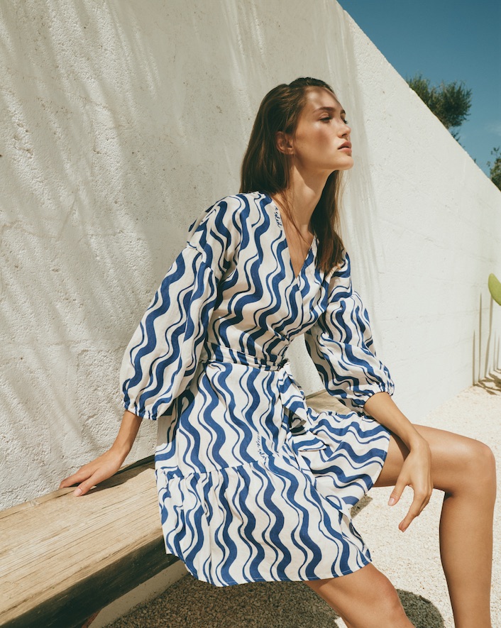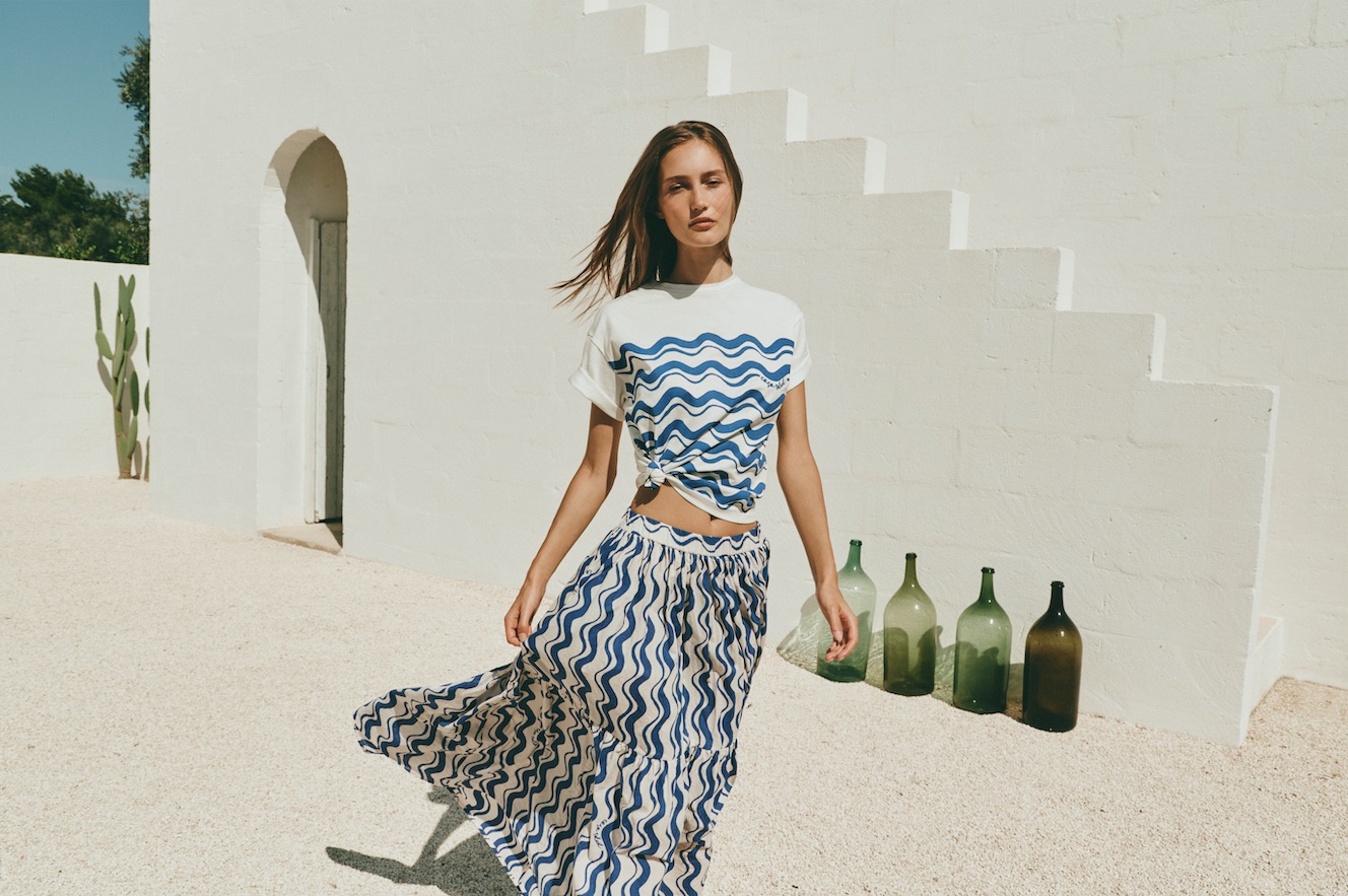 Volumi ariosi, mossi da arricciature, caratterizzano i capi della capsule. Lunghezze maxi e balze ampie per la gonna dal sapore gitano e l’abito sospeso a spalline sottili. Design incrociato e maniche a sbuffo per la blusa e l’abito corto che delineano la vita con lacci da annodare. Stampe a tema anche per la T-shirt che completa la collezione.