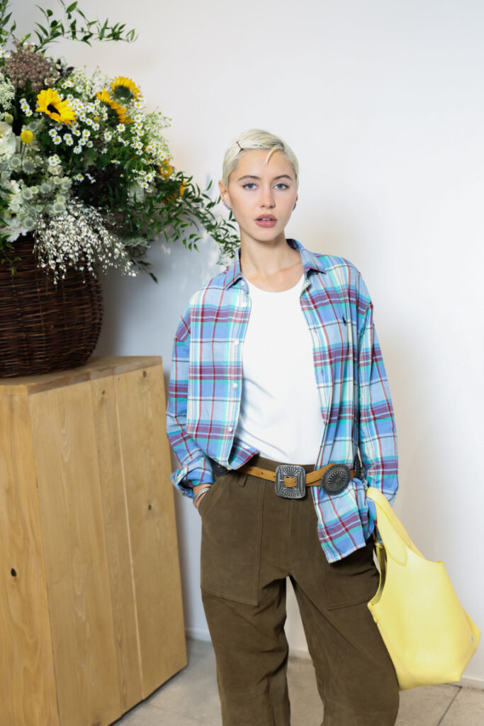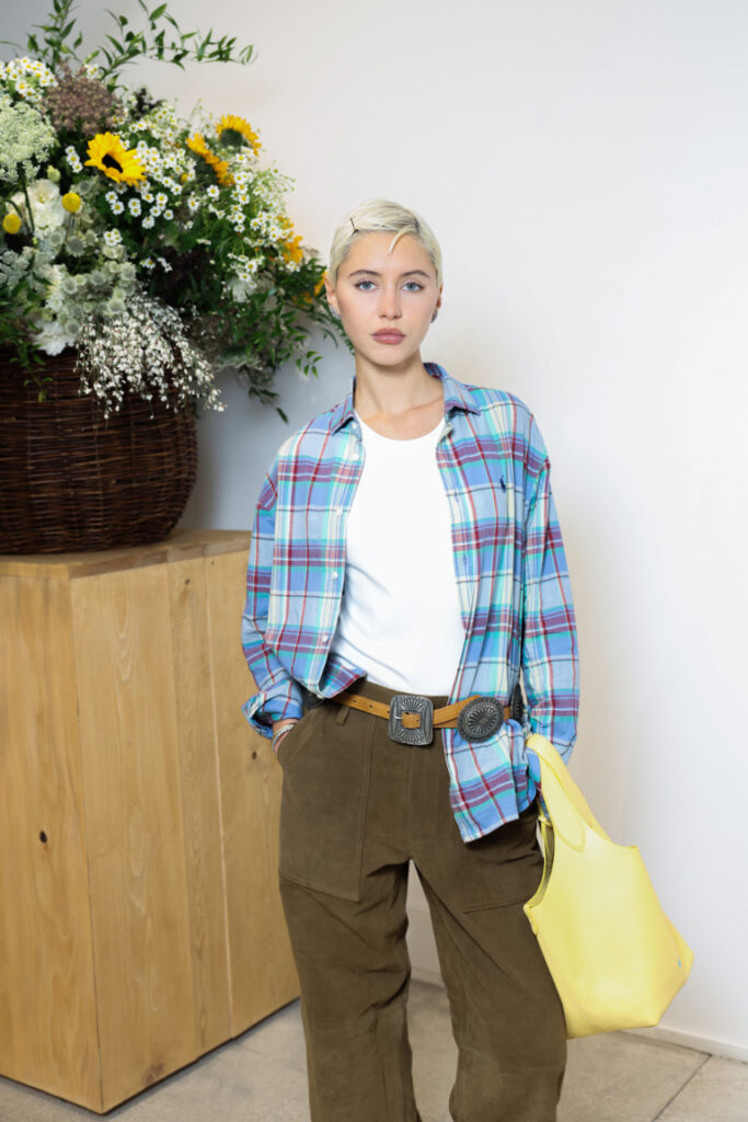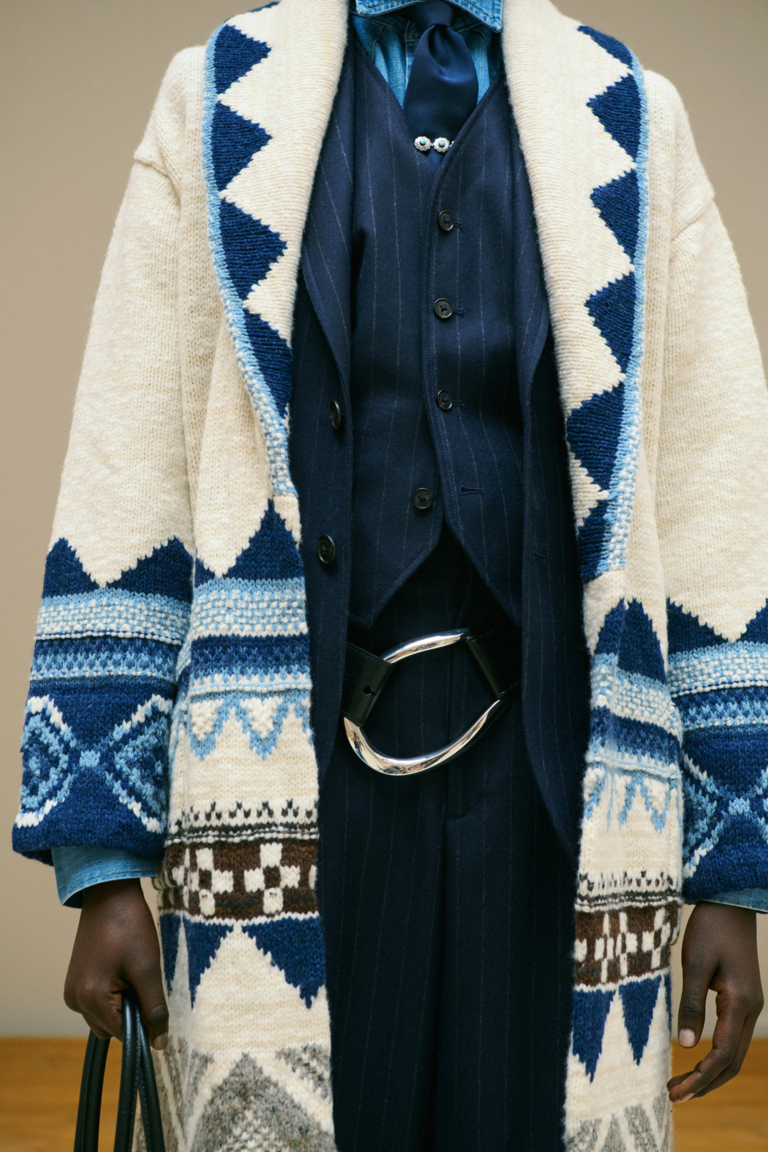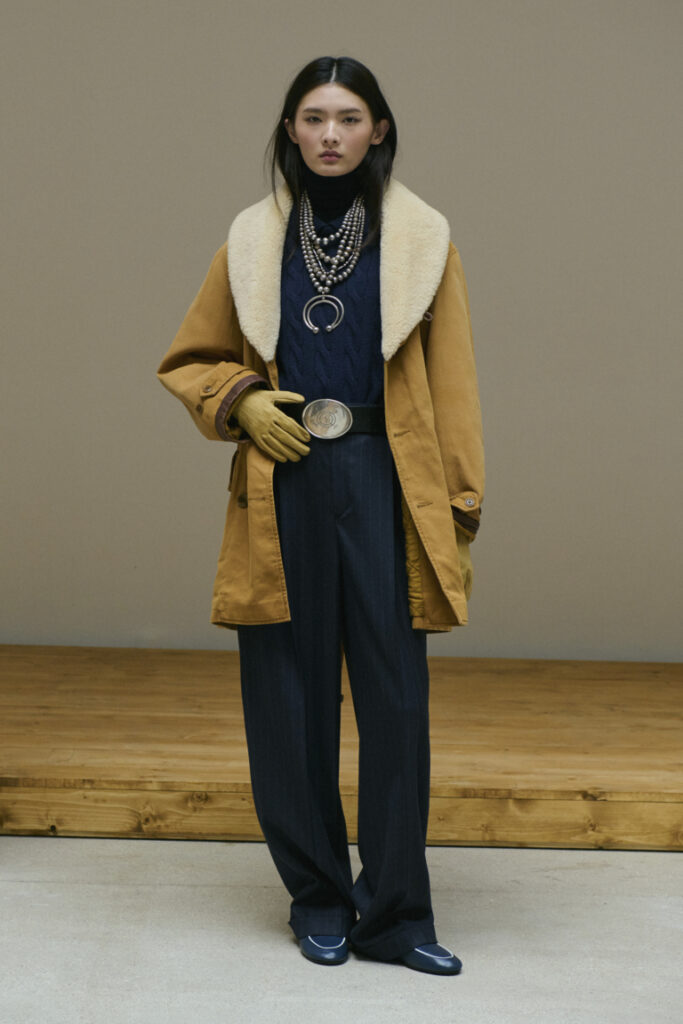 Il layering gioca un ruolo centrale nel definire lo stile della stagione, creando abbinamenti inattesi. Una camicia da smoking bianca con pantalone nero viene reinterpretata con una sciarpa a pois che richiama il cummerbund, completata da una cintura western e da un blazer annodato in vita. In un altro look, un dolcevita giallo brillante sotto una flanella colorata si abbina a una giacca da smoking dal taglio allungato con vita segnata. Questi contrasti esprimono quella sofisticazione disinvolta che caratterizza l’estetica Polo.