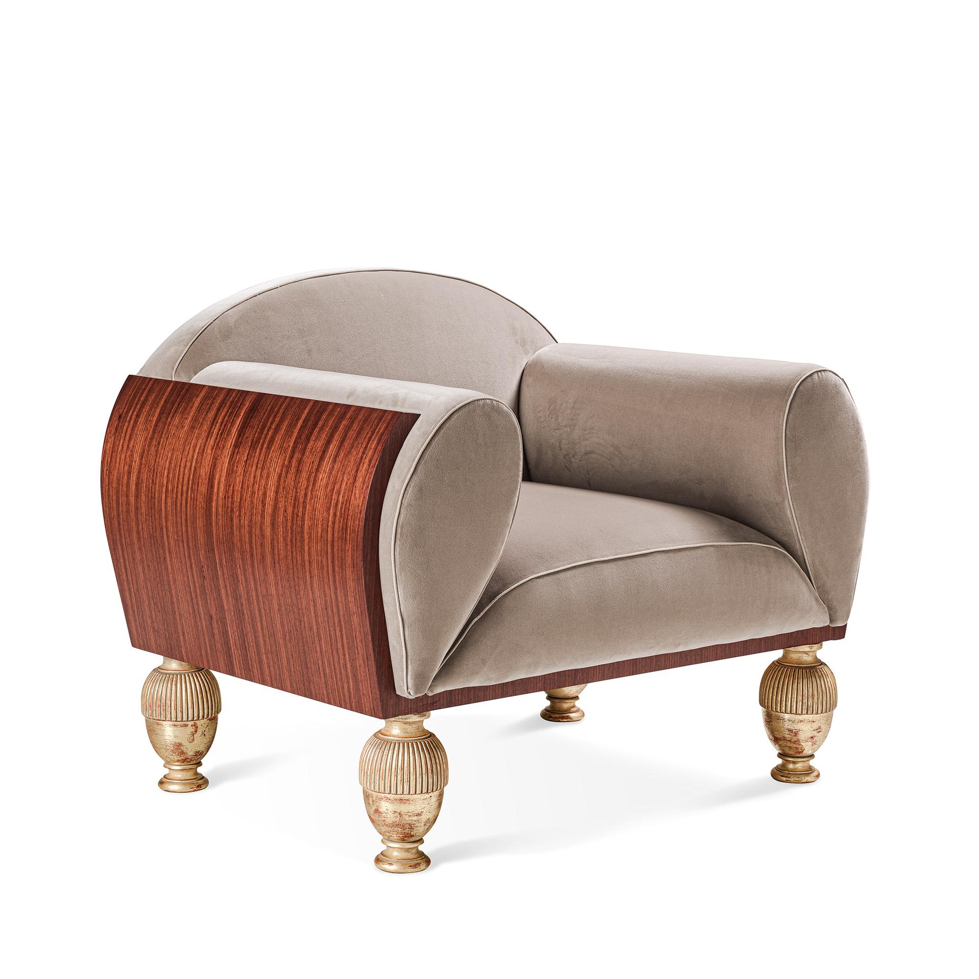 Provasi presenta Tan Armchair, poltrona dal design ricercato, contraddistinta da una struttura curvata placcata in legno Paduk, dal caratteristico color ruggine, che protegge la confortevole seduta rivestita in un velluto dalla tonalità tenue e delicata. La poltrona è impreziosita dal dettaglio dei piedini in legno intagliato a mano con finitura a foglia oro patinata.