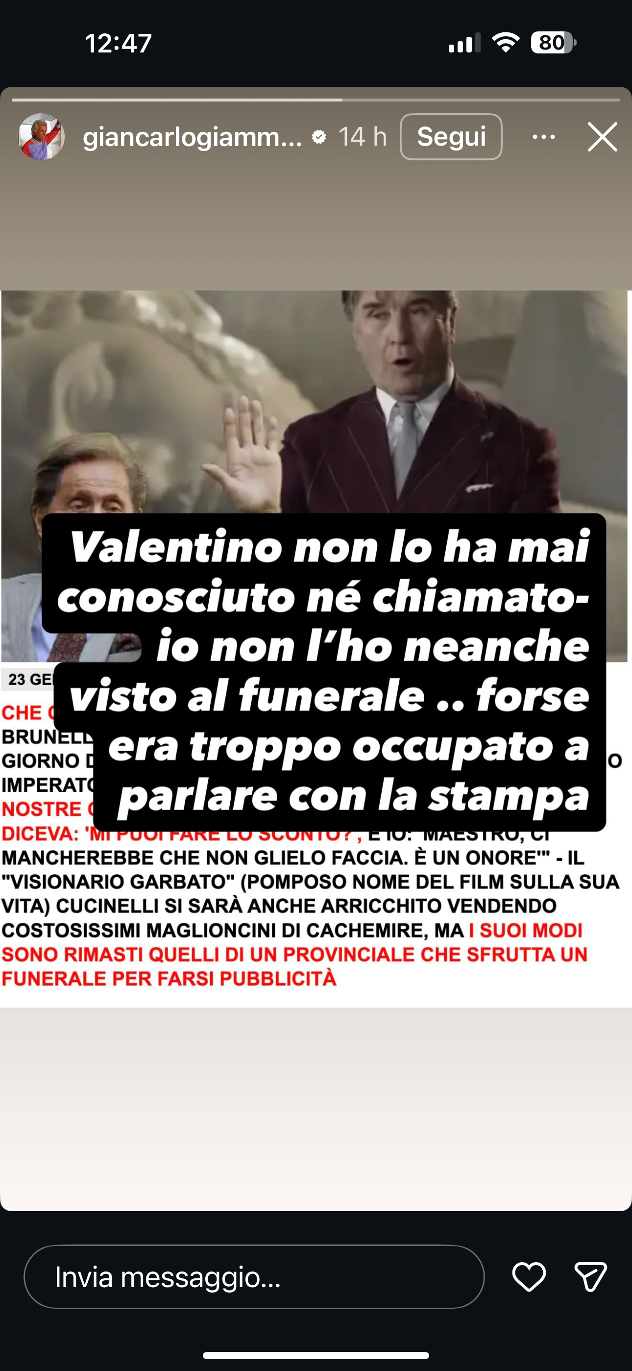 Oggi abbiamo i social per comunicare, ma spesso trasformano ciò che nasce senza intenzione in una polemica senza spiegare ma amplificando. Nel corso della commemorazione, un momento che richiedeva silenzio, anche la comunicazione può inciampare ( di questi tempi gli errori di comunicazione vanno di moda…). Brunello Cucinelli intervistato al suo arrivo in Chiesa da Barbara Modesti per Rai1 ha raccontato come Valentino, quando acquistava in boutique, lo chiamasse per chiedergli lo sconto. Poche ore dopo GIANCARLO GIAMMETTI ha smentito con un post secco sul suo profilo Instagram “Valentino non lo ha mai conosciuto né chiamato”. Viviamo in un tempo che ha sempre bisogno di una polemica, basterebbe un po’ di indulgenza, Brunello è fatto così, parla in modo semplice e diretto, ma non credo ci fosse mancanza di rispetto.