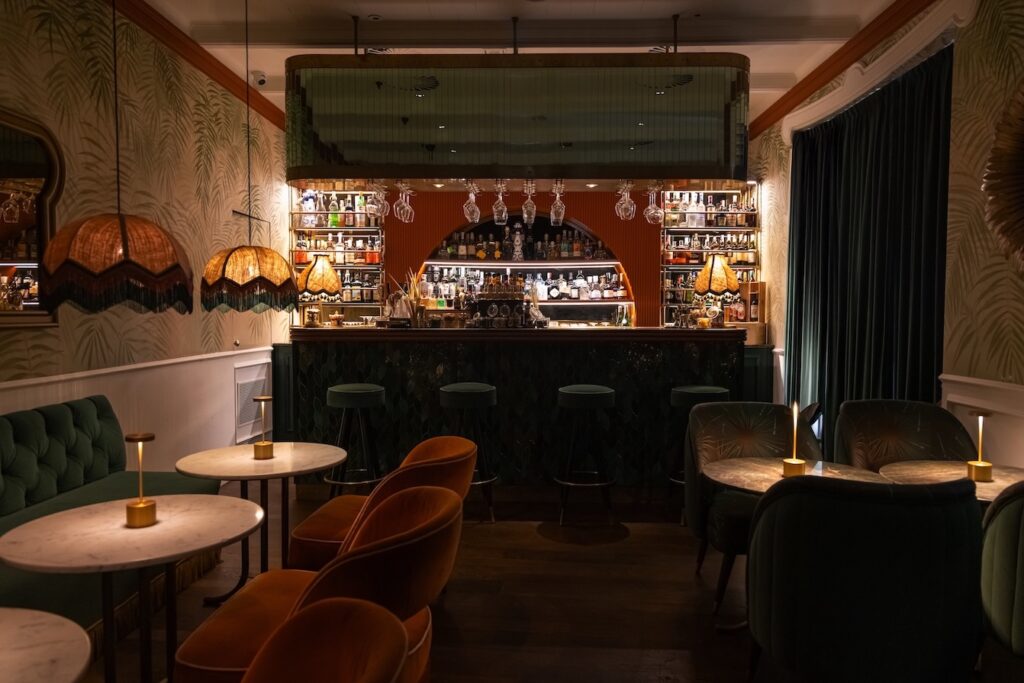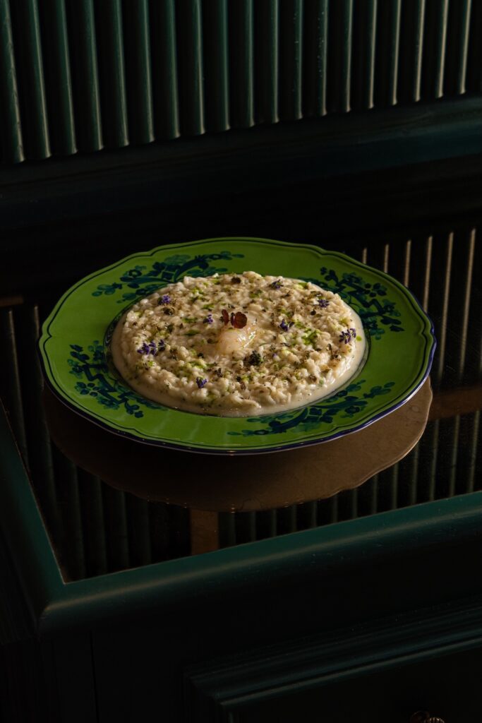 Gli interni, firmati da un progetto dal fascino rétro, mescolano verde salvia, corallo e ottone brunito con boiserie, velluti e lampade d’epoca. Al centro, il bancone bar in ceramica verde bottiglia diventa il cuore luminoso del locale e simbolo della sua anima conviviale.