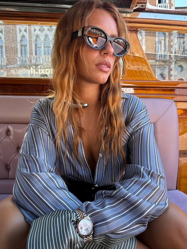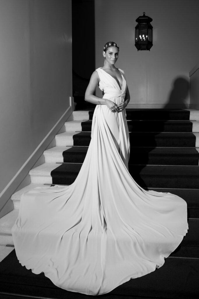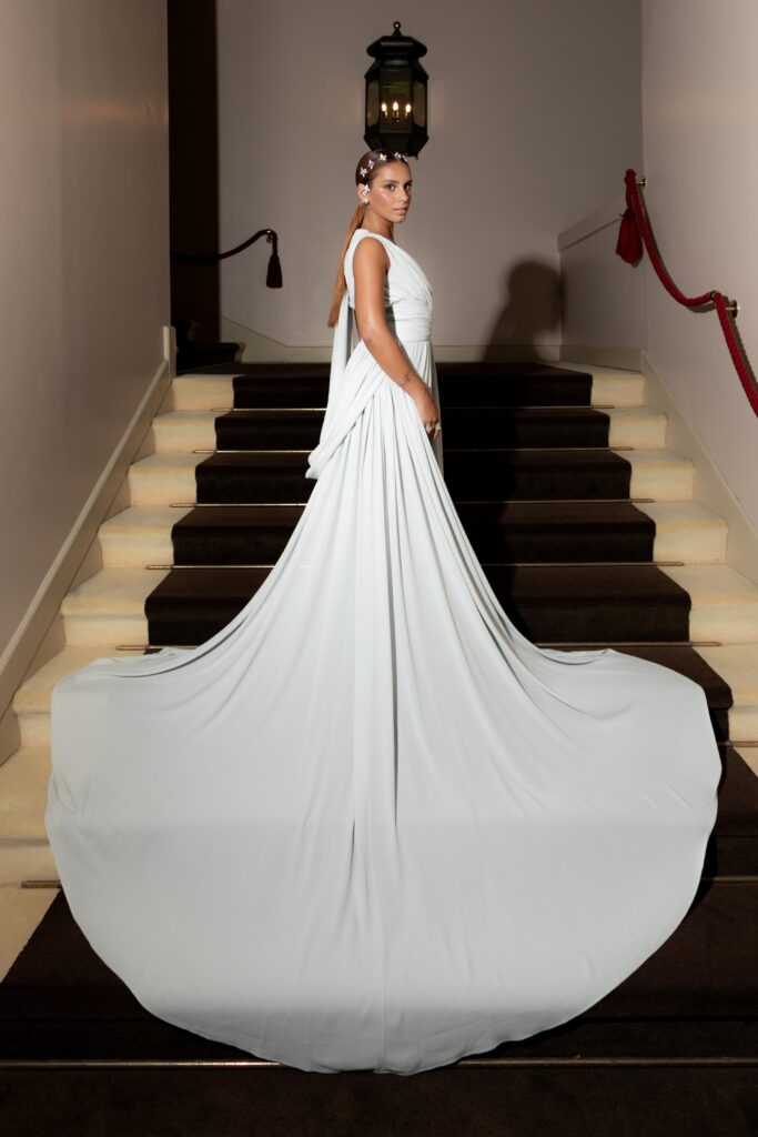 Protagonista è un abito d’archivio Dsquared² del 2013, mai indossato prima, in seta grigio perla, che richiama l’arte greco-romana con drappeggi fluidi e silhouette scultoree. A completare il look, un dettaglio beauty raffinato: le piccole api in diamanti firmate Sabbadini, intrecciate tra le onde dei capelli come un moderno “sciame gioiello”, reinterpretando la tradizione dei gioielli tra le chiome in chiave contemporanea. Le scarpe firmate Casadei aggiungono l’ultimo tocco di eccellenza italiana.