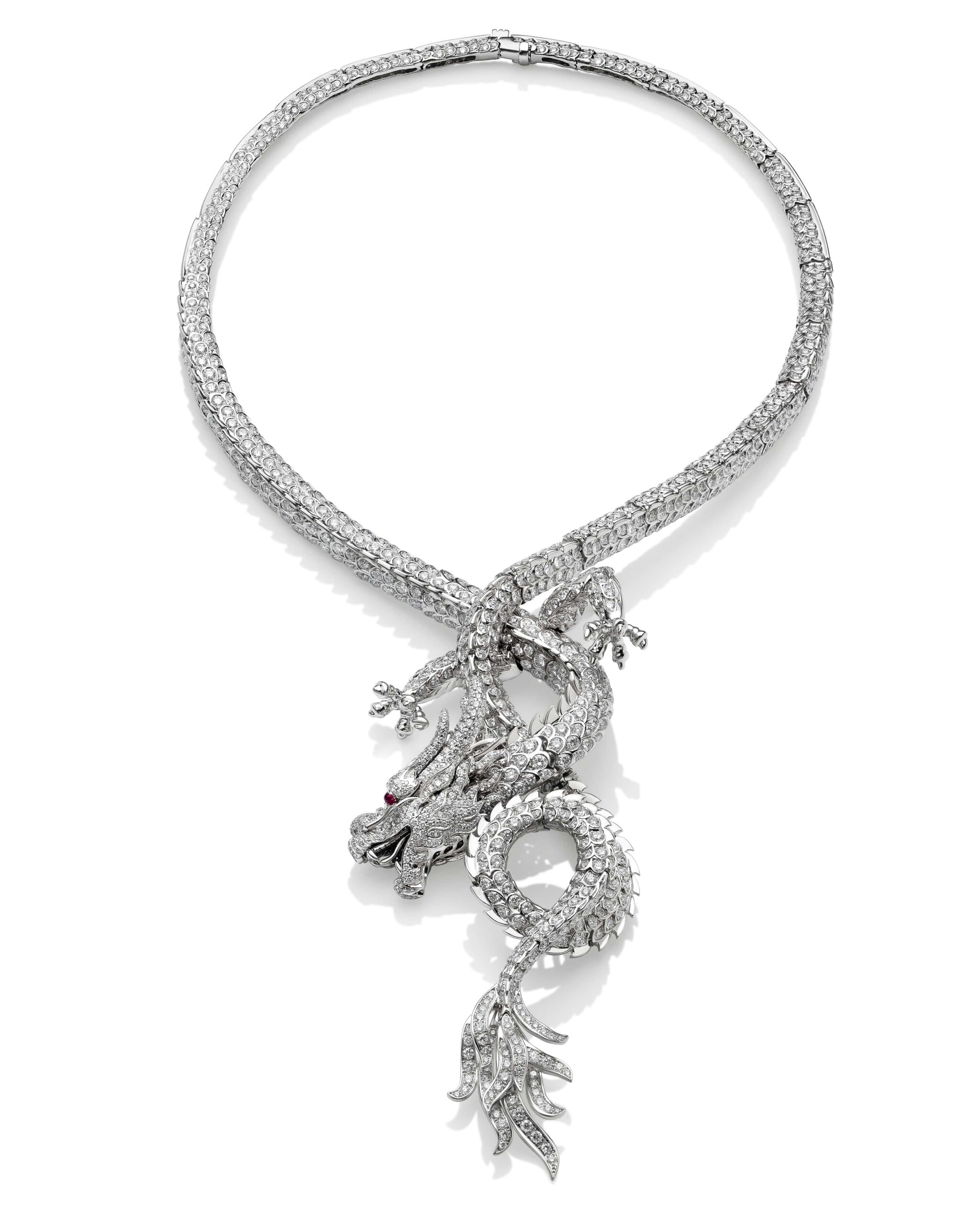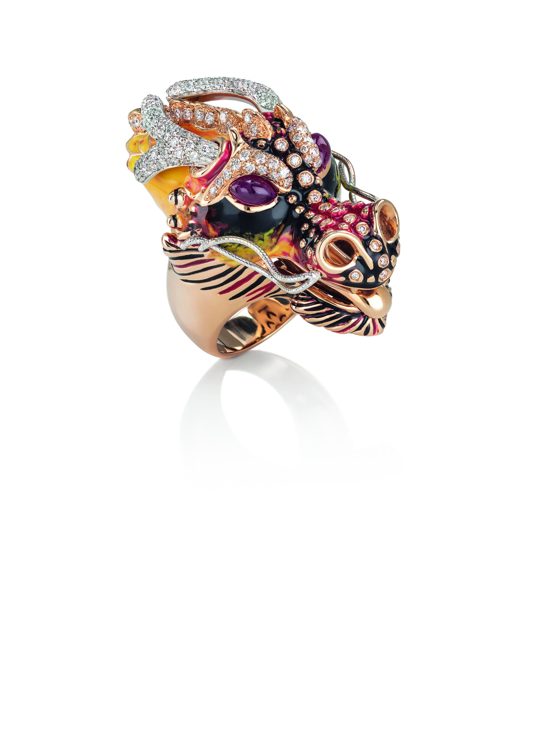 Un mix sublime di immaginazione, eleganza e tecnica illuminato da diamanti e smalti con due rubini posizionati a rivelare uno sguardo magico.