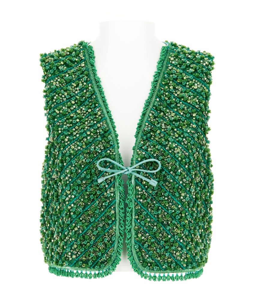 Il dialogo tra la collezione Pièce Unique e il savoir-faire di Roger Vivier si arricchisce con tre esclusivi gilet, realizzati in crema, smeraldo e oro. Ciascun capo riflette le tecniche artigianali delle borse, portandole a un livello superiore attraverso creazioni uniche e senza tempo. Ispirati ai monumenti simbolo di Parigi, i gilet trasformano l’essenza architettonica della città in opere sartoriali che celebrano un’artigianalità senza pari.