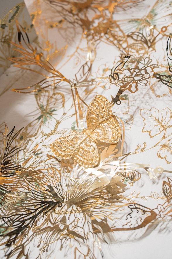 L’installazione costituisce la riproduzione fuoriscala di un abete bianco, adornato da più di settecento farfalle dorate, richiamo alla sfilata Dior Cruise 2024 e da flaconi luminosi delle fragranze iconiche di Parfums Christian Dior, come Miss Dior e L’Or de J’adore.