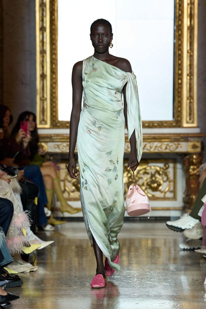 La palette cromatica riflette la vivacità della stagione: basi luminose di bianco, avorio e rosa cipria si arricchiscono di tonalità floreali come il giallo crisantemo, il verde cardamomo e i delicati lilla e rosa orchidea. Accenti di blu e bagliori metallici in argento e oro aggiungono profondità, evocando l’acqua e la luce estiva. I materiali e la maestria artigianale sono al centro della collezione, riaffermando il DNA della maison. Seta e jacquard presentano motivi floreali dipinti a mano e dettagli laser cut. Il ricamo haute couture diventa protagonista: perline di vetro scintillanti, ricami narrativi di tradizione indiana e paillettes applicate con la precisione dell’alta gioielleria. Una novità di questa stagione è l’uso della tessitura tradizionale cinese a cordoncino, riconosciuta come patrimonio culturale immateriale, che dà vita a strutture floreali tridimensionali dall’impatto scultoreo.