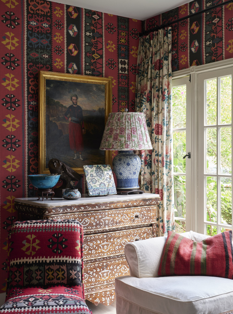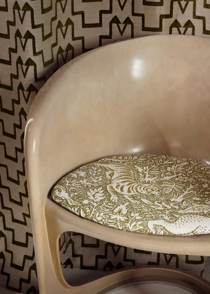 Dall’altro, la collaborazione “Johnson Hartig of Libertine x Schumacher” introduce una visione più libera e istintiva del décor. Il designer Johnson Hartig porta nel mondo dell’interior il suo linguaggio eclettico, fatto di riferimenti che spaziano dalla cultura punk all’arte classica. Il risultato è una collezione vibrante, dove pattern grafici, floreali e geometrici si intrecciano in combinazioni audaci ma armoniche, tra memoria storica e reinterpretazione contemporanea.