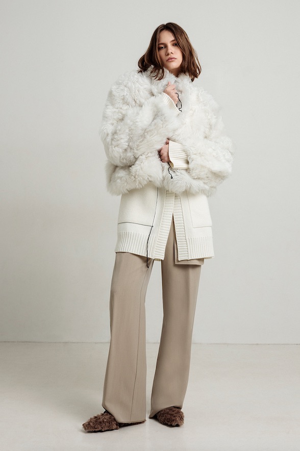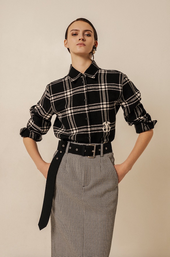 Tessuti in cover di lana rendono giacche, cappotti e pantaloni strutturati ed importanti. L’immaginario creativo di Manuela Mariotti propone anche un gioco di check micro e macro abbinati ad un pattern pied de poule per una capsule che spezza e rafforza l’esplorazione e la sperimentazione di questa nuova collezione.