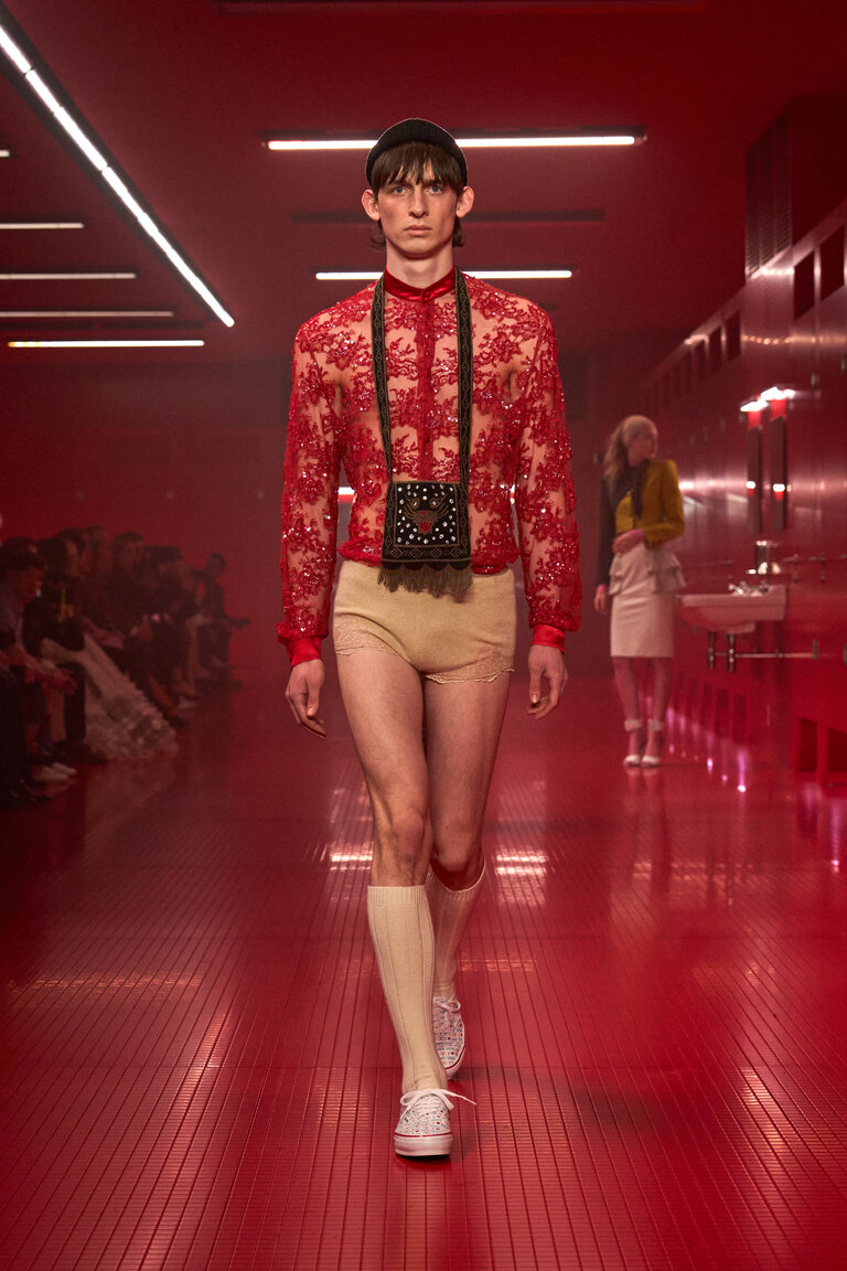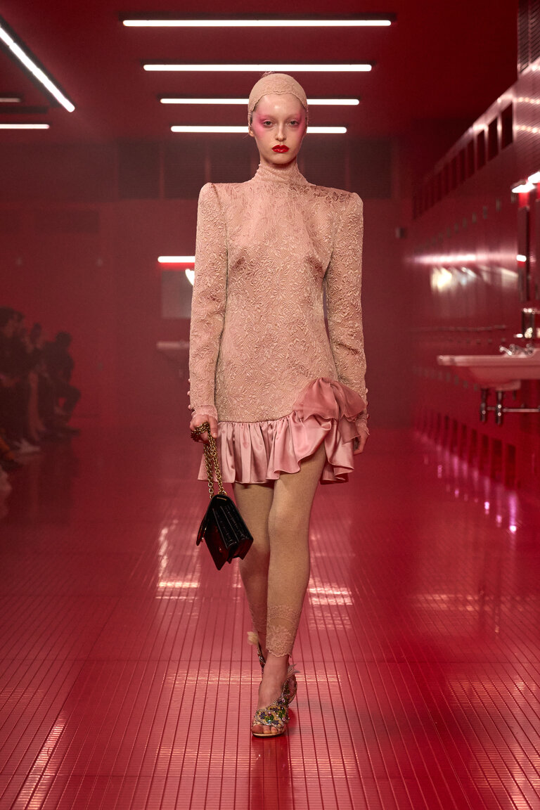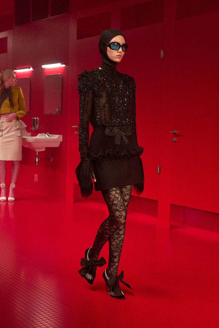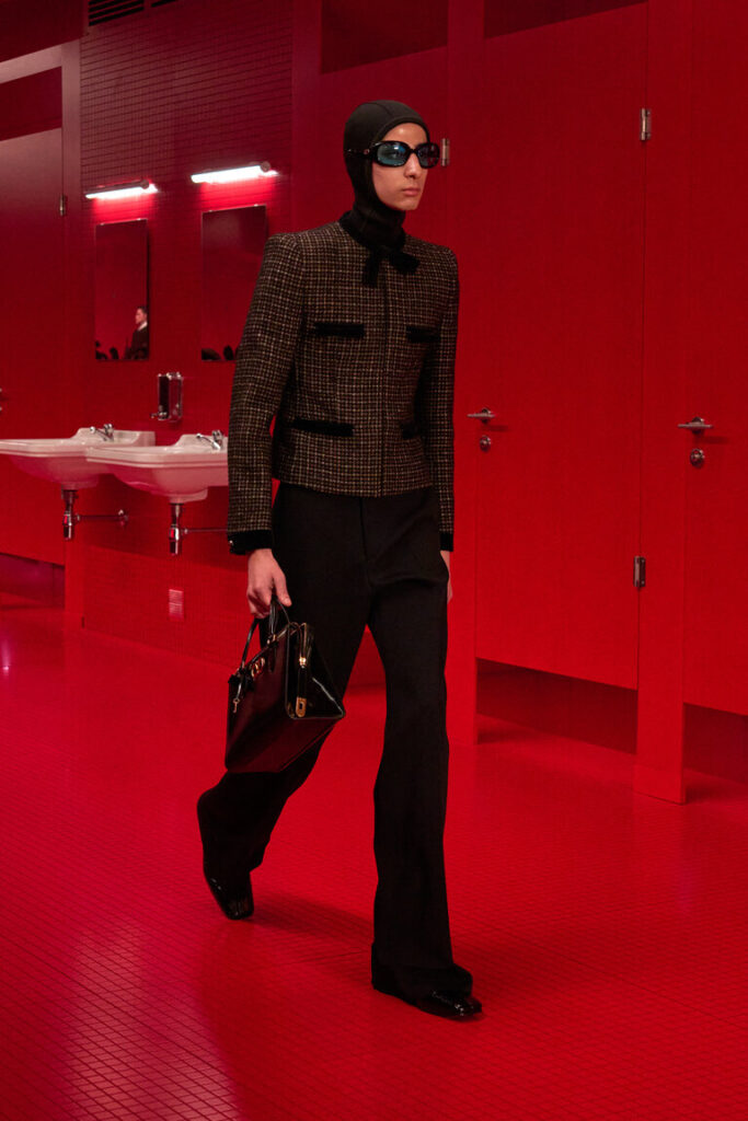 Un bagno pubblico, un contro-luogo che neutralizza e sospende il dualismo tra interno ed esterno, tra ciò che è intimo e ciò che è esposto, tra il personale e il collettivo, tra ciò che rimane privato e quello che si intende condividere, tra profondità e superficie. La location della sfilata VALENTINO LE MÉTA-THÉÂTRE DES INTIMITÉS FALL-WINTER 25/26 esalta l’intimità come rifugio nel tentativo di ritrovare un sé autentico. Alessandro Michele lo definisce uno spazio di apparizione in cui l’intimità riconquista il proprio ruolo di costruzione identitaria, tra vestizioni e svestizioni.