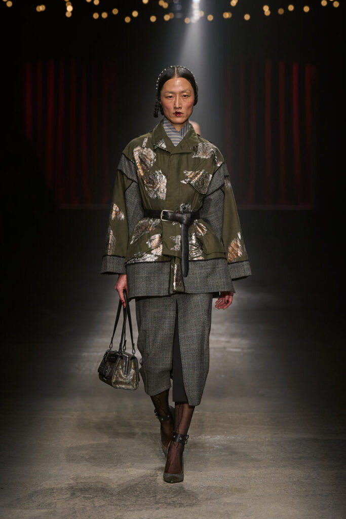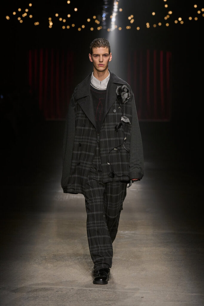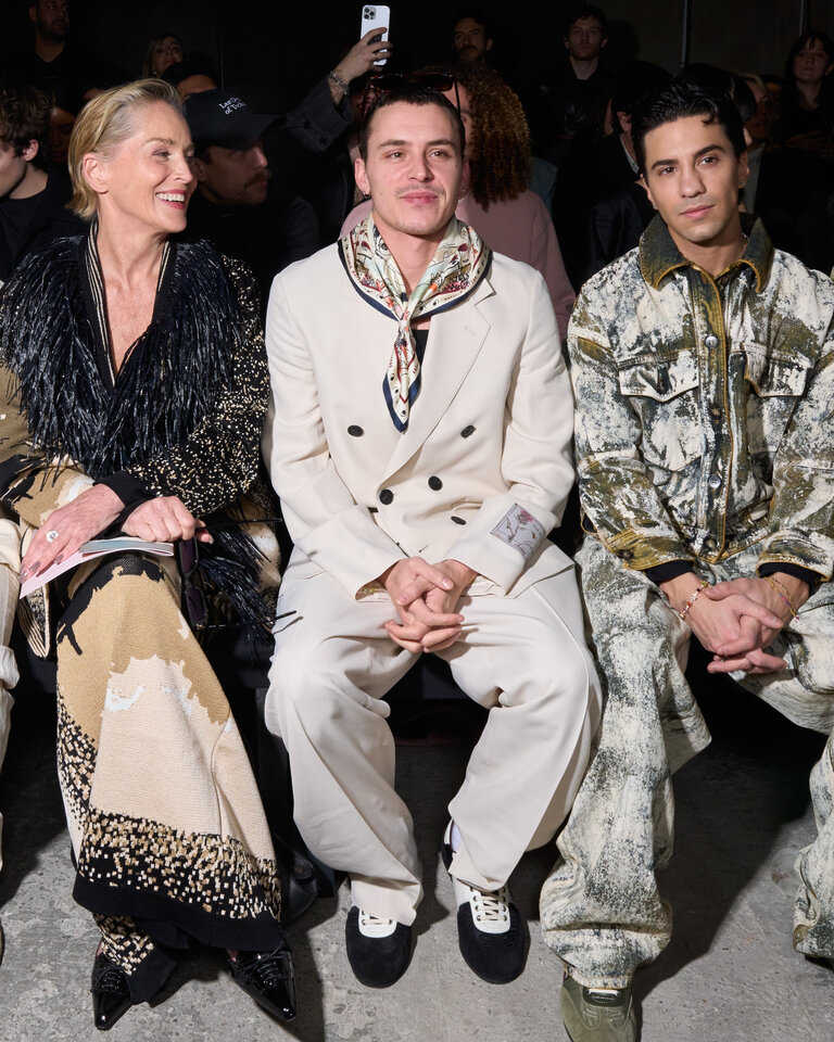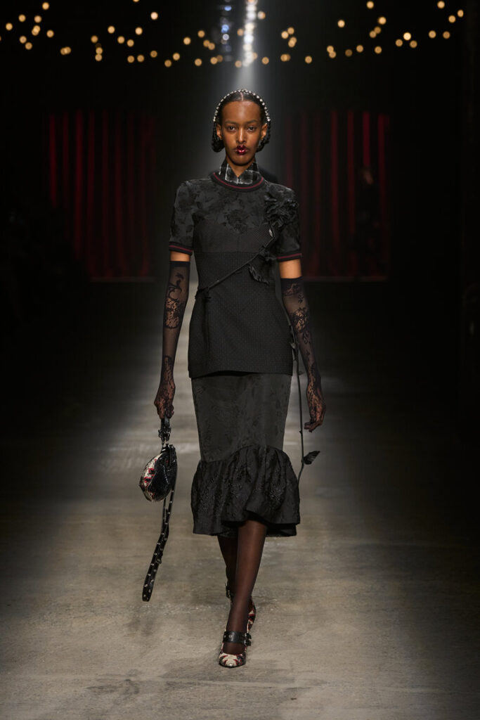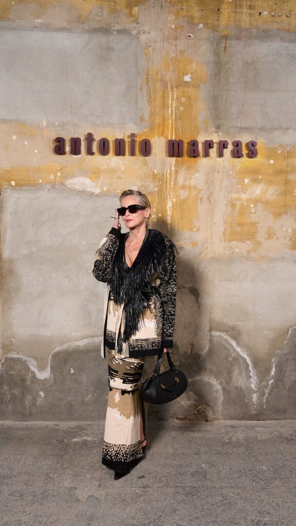 La Bella d’Alghero è un melodramma che racconta la tipica storia di lei, lui, l’altra. Due sorelle si contendono un uomo e tra litigi e rifiuti finisce (spoiler) con la morte del protagonista, Efisio, l’uomo del contendere. Alghero fa da sfondo a questa vicenda e chi più di Antonio Marras poteva incantare con la sua moda che inscena il desiderio e il melodramma insieme. Ricami, decori e inserti si intrecciano a pennellate di schizzi, quasi che l’abito fosse un foglio bianco su cui versare i suoi motivi caratteristici: le mani, le rose, i punti e le linee e i ritratti. “Mi appassiona dar voce a cose apparentemente mute, perché diventino abiti che parlano” dice lo stilista, che anche grazie al Gruppo Calzedonia oggi è libero di continuare a creare bellezza. E chi più di Sharon Stone, diva iconica, a rappresentare bellezza e amore.