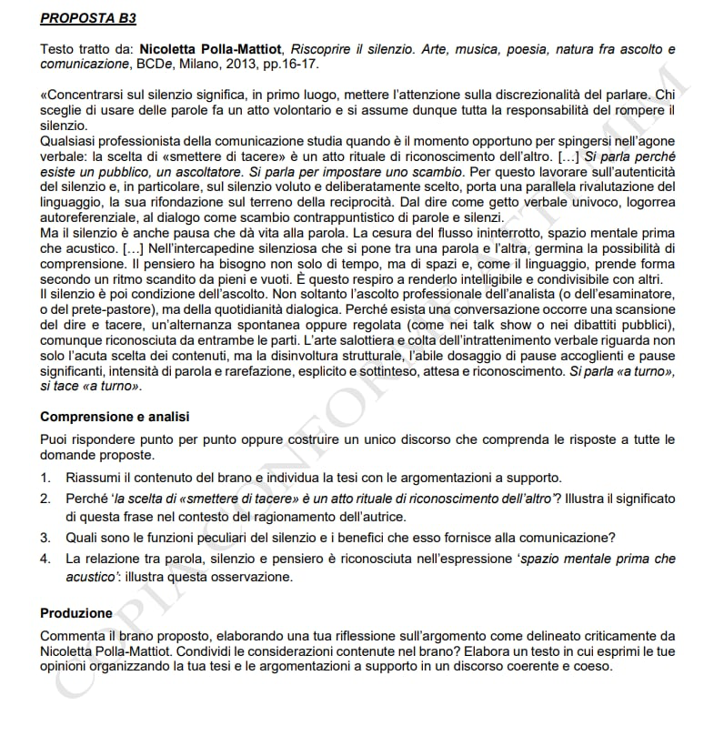 Nicoletta Polla-Mattiot, che stimo come collega, amica e giurata del mio CHI E’ CHI AWARDS, con il testo tratto da un suo articolo RISCOPRIRE IL SILENZIO è stata protagonista degli esami di maturità di quest’anno. “Concentrarsi sul silenzio significa mettere l’attenzione sulla discrezionalità del parlare. Chi sceglie di usare delle parole fa un atto volontario e si assume tutta la responsabilità del rompere il silenzio”.