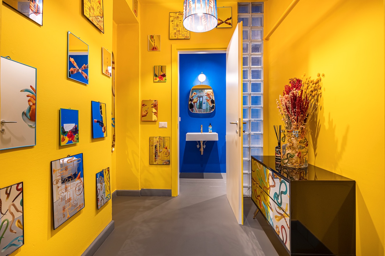 L’appartamento è un ex laboratorio di fine 800/inizio 900, oggi loft, a Milano, in zona Sempione, ed è davvero unico nel suo genere perché le pareti sono totalmente decorate con carta da parati firmata Toiletpaper, l’originale e divertente concept ideato dall’artista Maurizio Cattelan e dal fotografo Pier Paolo Ferrari.