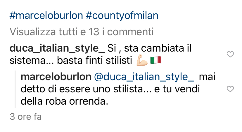 Nei miei momenti di riflessione sul divano con copertina e telefono mi sono soffermata su un po’ di cose. Prima di tutto la notizia di Marcelo Burlon che lascia il suo marchio County of Milan da lui fondato nel 2012. A darne la notizia è lo stesso Burlon dal suo profilo Ig con un bel messaggio sul suo percorso e sulla nuova strada che sarà gestita dal team interno (per ora). Mi è caduto l’occhio su un commento di @duca_italian_style in cui scrive ” basta finti stilisti” e @marceloburlon risponde “mai detto di essere uno stilista… e tu vendi della roba orrenda”. Un po’ di stizza … la tendenza mi sembra sia quella di dire quello che si ha in testa e di non pensare alle conseguenze.