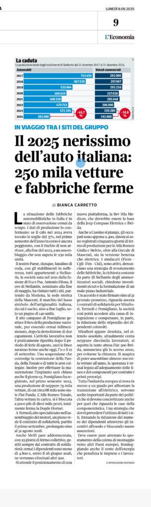 Il nostro Paese, dunque, fanalino di coda, con gli stabilimenti in sofferenza, tutti appartenenti a Stellantis, la società nata nel 2021 dalla fusione di Fca e Psa. Antonio Filosa, il ceo di Stellantis, nominato alla fine di maggio, ha visitato tutti i siti, partendo da Modena, la sede storica della Maserati, il marchio del lusso simbolo dell’artigianalità italiana, da cui è uscito, sino a fine luglio, solo un pugno di 140 unità.