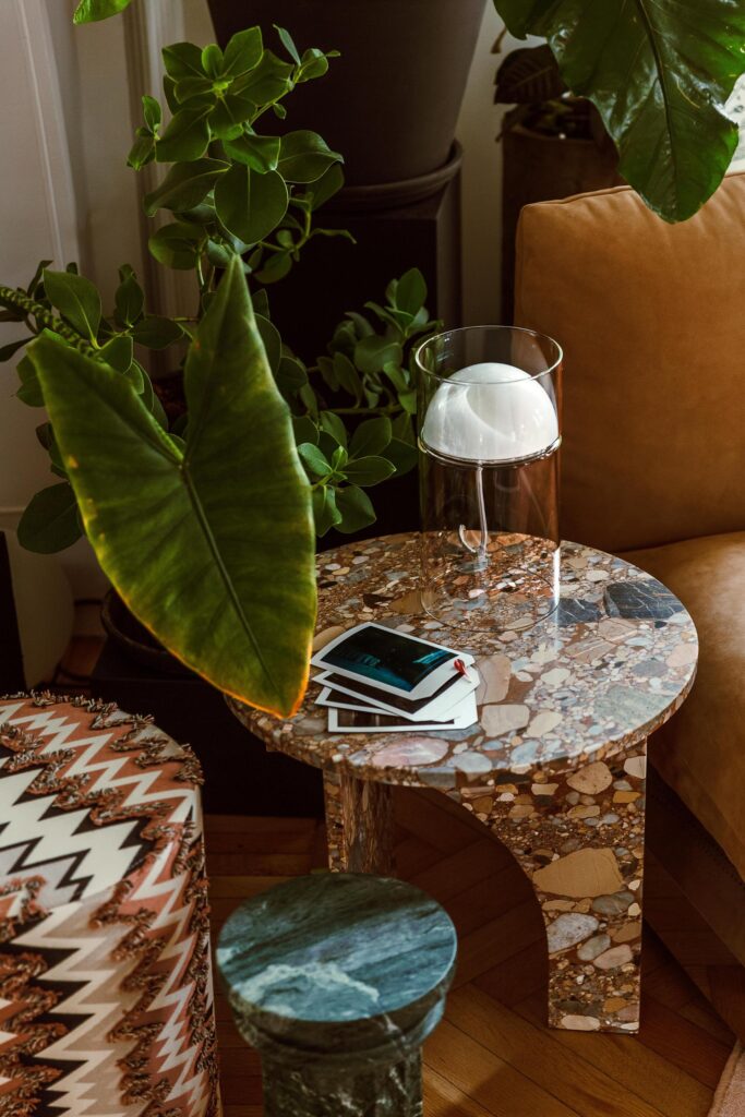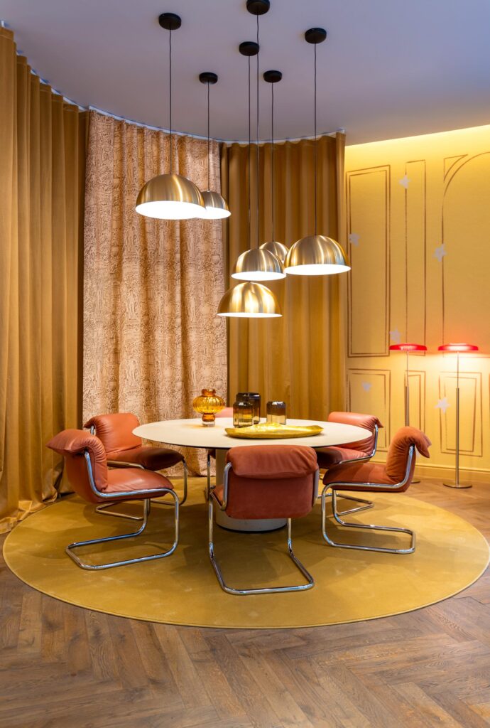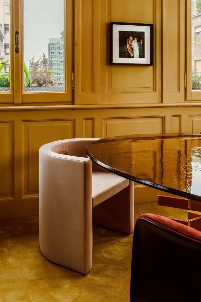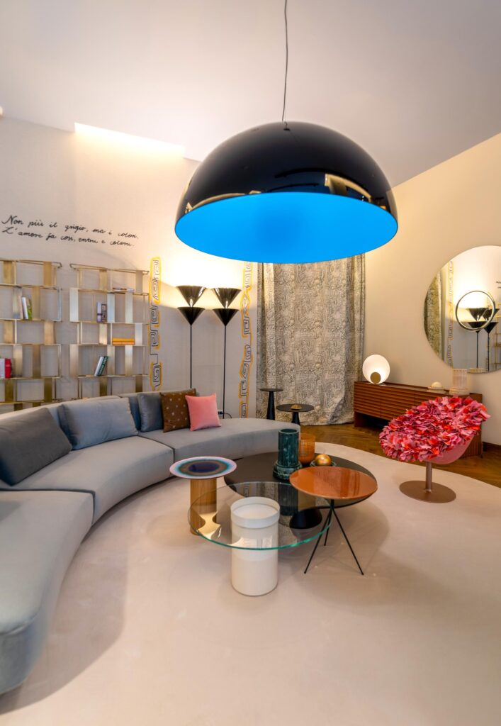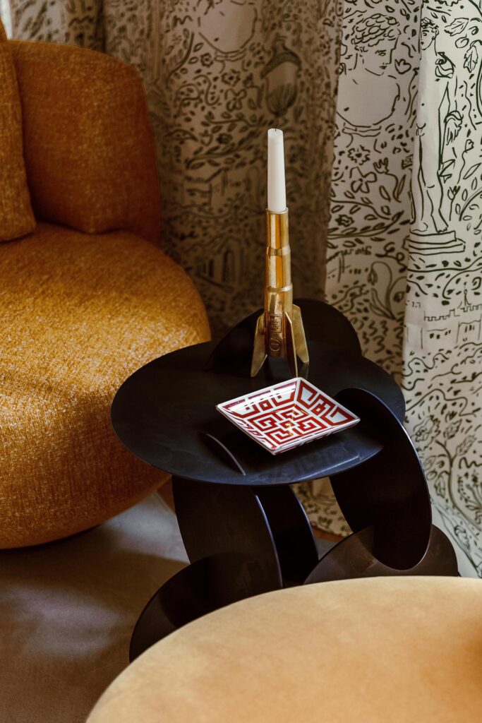 Nella zona living, il tavolino Selce di Studiopepe spicca accanto alle poltrone Audrey di Massimo Castagna, mentre i tavolini Monete, che portano sempre la firma di Massimo Castagna, presenti sia nella versione laccata che in quella ottone brunito a mano, completano l’ambiente con eleganza. Le sedie H2O di Studiopepe arricchiscono ulteriormente lo spazio, rendendo ogni angolo unico e in perfetta armonia con il design della casa.