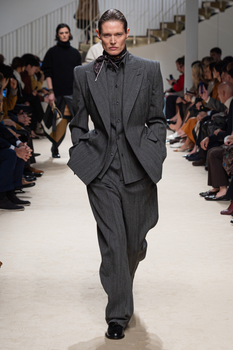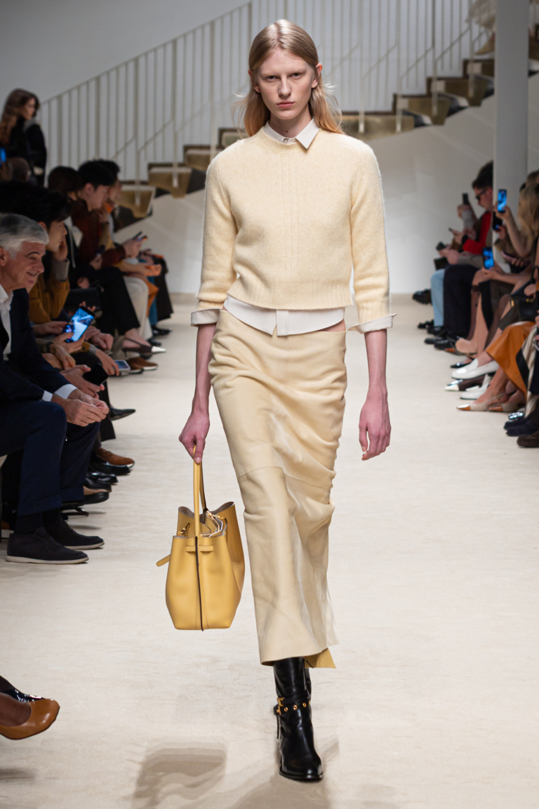 La collezione Donna Autunno/Inverno 2026/27 di Tod’s celebra l’eccellenza artigianale italiana, con una sfilata che unisce il gesto creativo degli artigiani a capi di altissima qualità. La pelle domina la proposta, declinata in capispalla, trench, peacoat, bomber trapuntati e abiti foulard in patchwork grafici, accostando volumi ampi a silhouette più aderenti. La palette spazia dai toni naturali intensi, caramello, ginger e cioccolato, a accenti grafici bianco e nero. Il pellame Pashmy esprime morbidezza, profondità cromatica e funzionalità. Tra le calzature, il mocassino iconico Tod’s si rinnova con punta arrotondata in pelle o cavallino, stivaletti con cinturino selleria e le sneaker Gommino in suede flessibile. Le borse Wave Bag, T Timeless Bag e Di Bag incarnano raffinatezza e funzionalità, mentre il Gommino diventa dettaglio distintivo anche negli accessori. Il lettering metallico sulle cinture permette la personalizzazione, reinterpretando il savoir-faire storico in chiave moderna e confermando la Intelligenza Artigianale del brand.