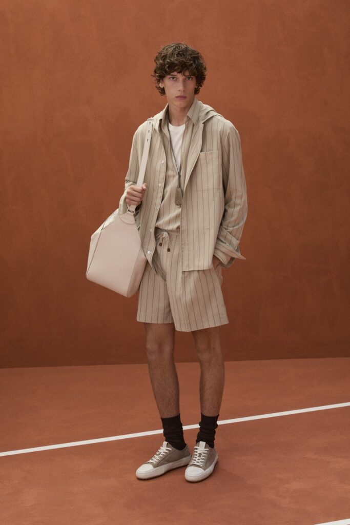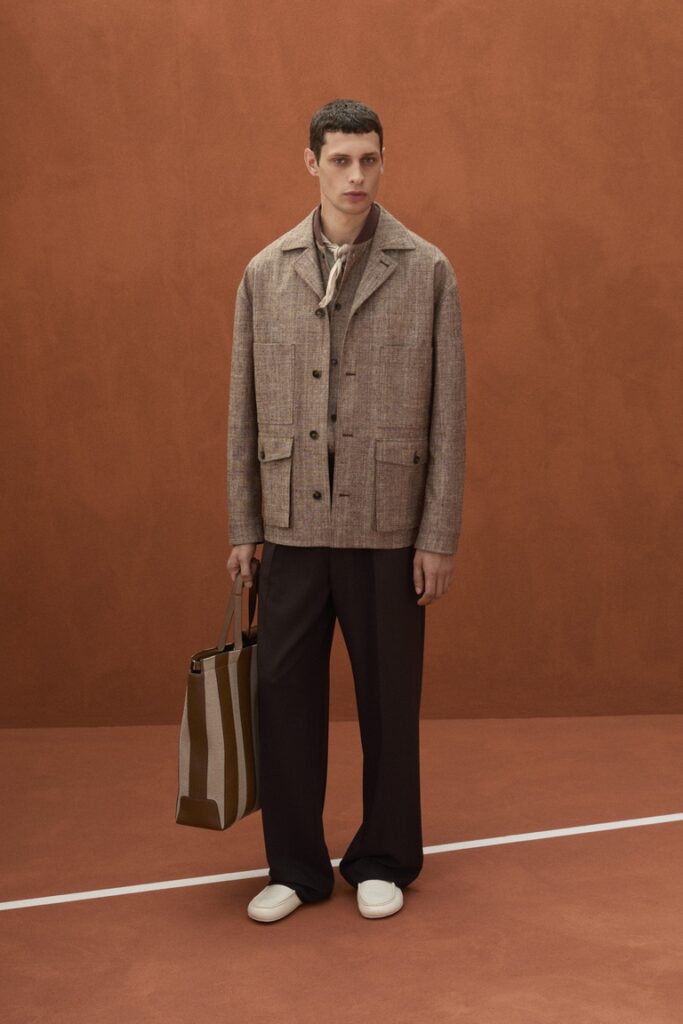 Il materiale principe della collezione è il Pashmy, apice della ricerca e selezione dei pellami più pregiati. Il Pashmy si distingue per una mano estremamente morbida e setosa e viene declinato nei grandi classici del guardaroba maschile: il bomber, il blazer destrutturato e la coach jacket. Il lino, altro protagonista della collezione, è presentato nelle versioni crêpe, satin e lino-seta e dà vita a capi con un’attitudine rilassata e sofisticata, come la nuova sahariana.