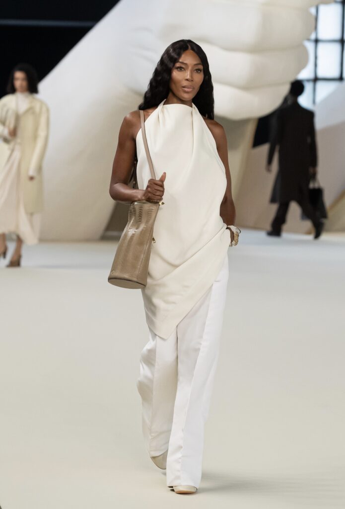 L’iconico trench, in cotone e in pelle, assume nuovi volumi fluidi in varie lunghezze, mentre la giacca a vento è proposta in cotone resinato o in leggerissima nappa. Giacche e camicie in crêpe mélange danno vita a capi sartoriali, come il completo che abbina una giacca cropped a pantaloni slim in diverse tonalità. La palette si concentra su toni naturali, ispirati alla pietra, alla sabbia, al bronzo e ai colori vibranti dei paesaggi italiani: il verde dei prati, il blu del mare e il rosso della terra.