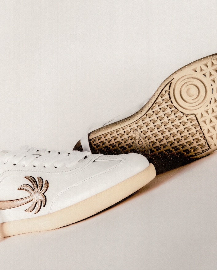 Due elementi caratterizzano questa collaborazione: la palma in pelle nera oppure in oro, allungata ai lati della tomaia, richiama lo spirito libero da West Coast di Palm Angels e gli inconfondibili gommini di Tod’s, elementi funzionali trasformati in decorazione, posti nella parte posteriore, sono un bassorilievo moderno che evoca il patrimonio artigianale, l’unicità e l’Italian Lifestyle incarnati da Tod’s.
